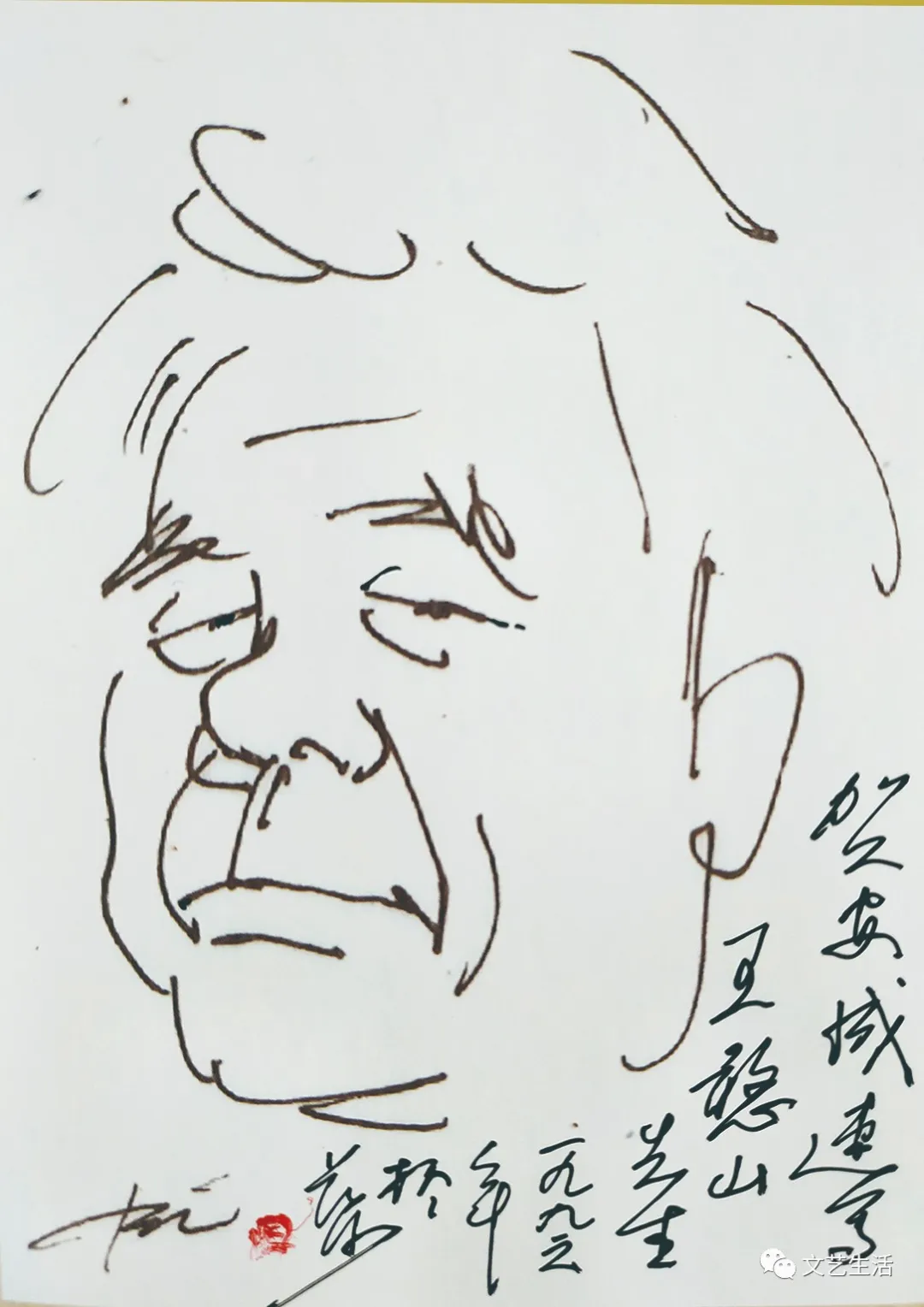 当王朝闻激动地讲到齐白石是一座大山时,突然响起了王憨山重重的鼾声,隆重而和谐的气氛陡然变了。只见王朝闻面带怒色将讲话提纲迅速折拢放进口袋,终止了他的谈话,但还是宽厚地说了句:“王先生怎么睡着了?可能是太疲劳了,今天就算了吧。”我连忙打圆场,说了很多解释的话,等气氛稍微缓和了些之后,我请求王朝闻在王憨山的相册上题个词。只见王老又拿出一张纸来照着抄写,连题词他也预先准备好了,这令我们感动万分。