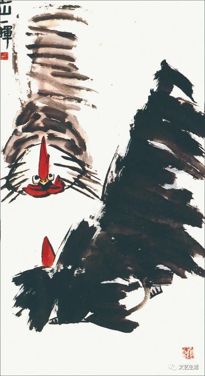 王憨山却是一个很难说“不”的人。各式各样的笔会让他有点招架不住,年年月月不知耗费了他多少宝贵时间。凡在笔会上完成的作品,大多是逢场作戏不断重复的应酬之作,很难有精品产生。我有一次亲眼见到王憨山在一次笔会上,用了整整一瓶墨汁在两米左右的宣纸上满满地画了一只母鸡,画面上除了在鸡冠和印章处有点红色外,整幅纸上就是一个大墨坨,被围观的人戏称是“天下第一鸡”!