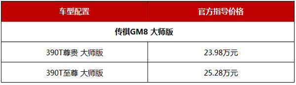 6月15日,倍受瞩目的传祺GM8 大师版正式上市,新车将带来两个不同版本,其中390T尊贵 大师版官方指导价23.98万元,390T至尊 大师版官方指导价25.28万元,并提供珍珠白、孔雀蓝、典雅黑、摩卡棕四个颜色。