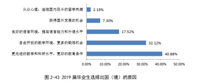 而选择出国留学的原因多数是因为“希望获得更好的教育教学条件和科研氛围”,在西南大学的调查结果中这一项占据了毕业生出国原因的50%,其次则是“增加择业资本,增强就业竞争力”。