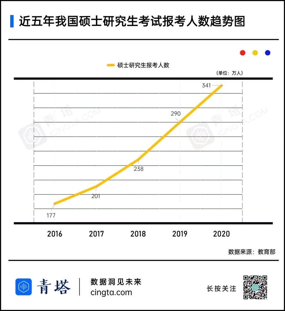 根据教育部公布的最新数据显示,2020年硕士研究生考试报名人数高达341万人,相较于去年增加51万人,报名人数再次刷新历史之最,