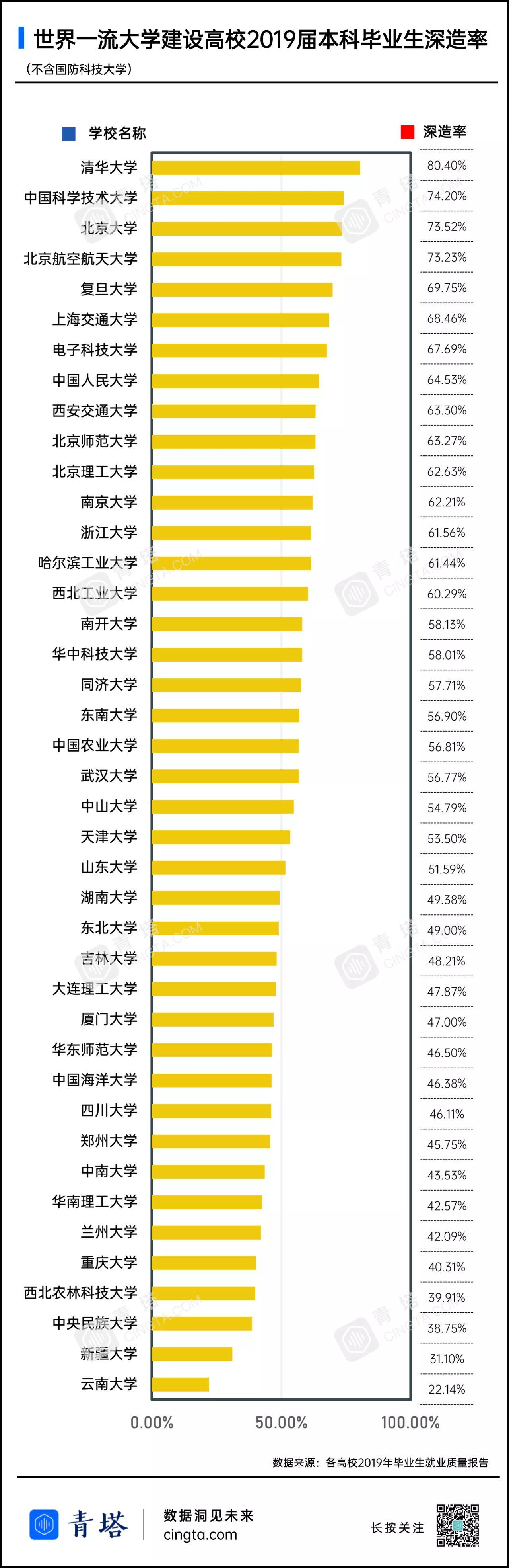 青塔针对2019年各大高校公布的毕业生就业质量报告进行了收集整理,共有128所“双一流”建设高校的本科毕业生深造情况被纳入本轮统计。