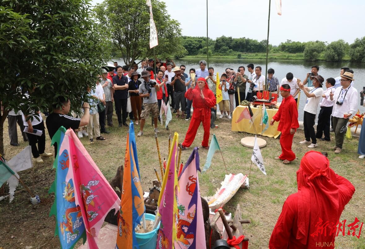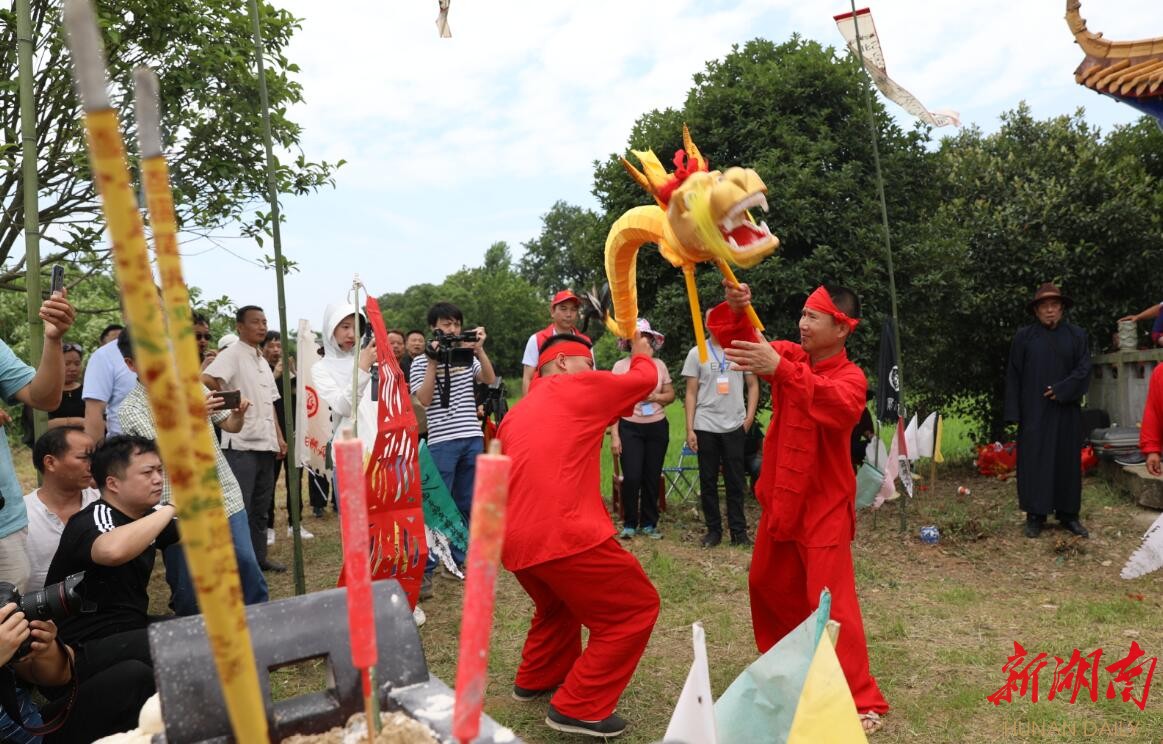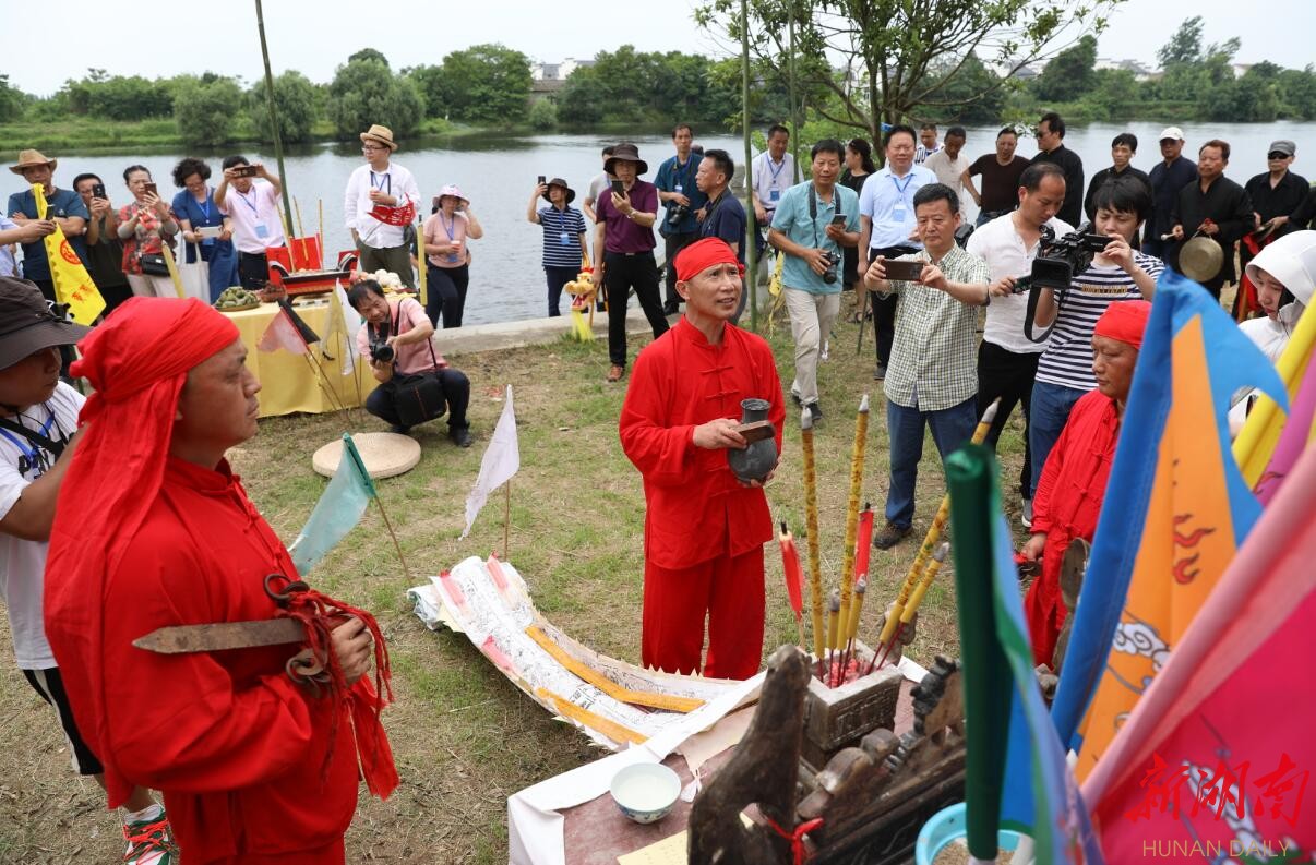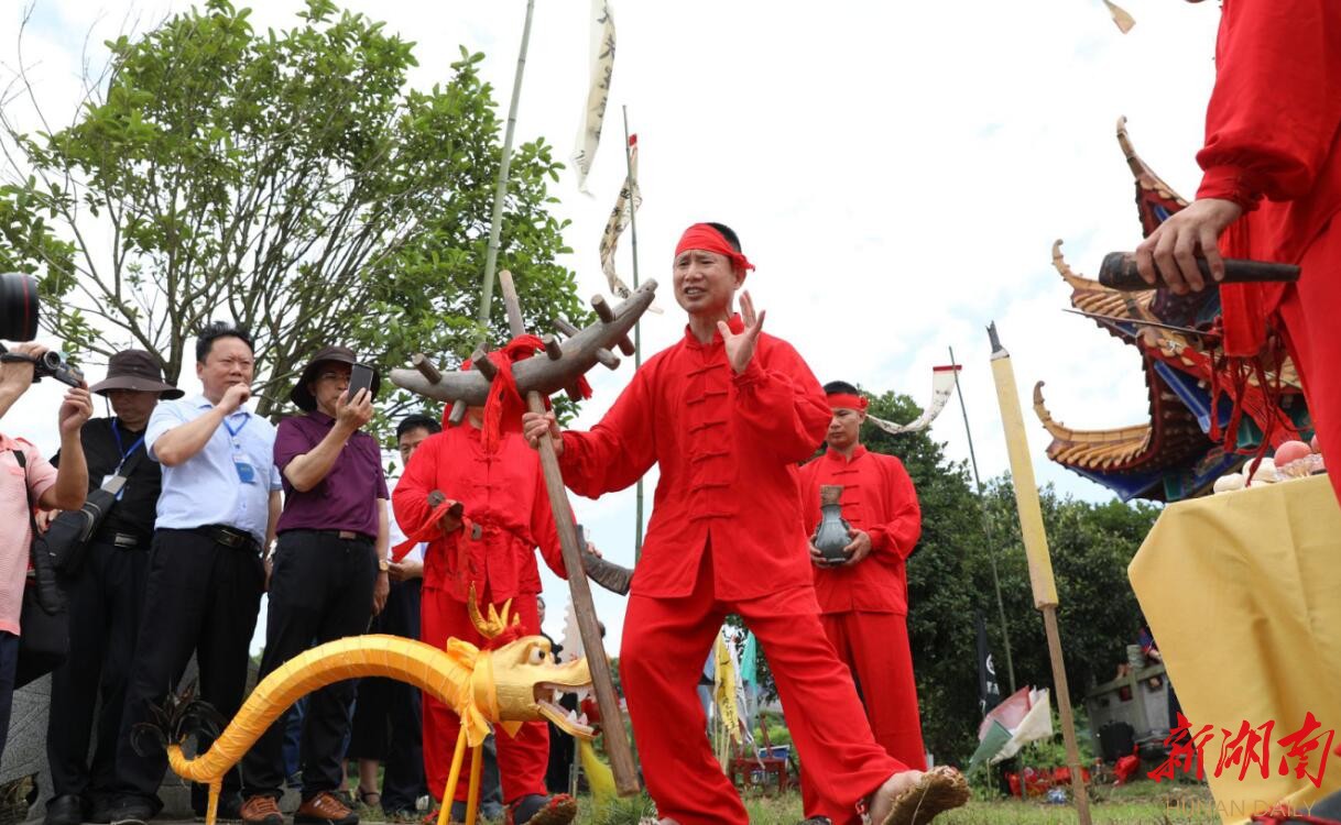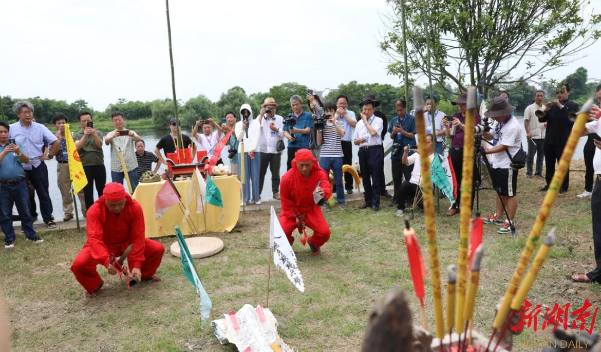 当天,河泊潭楚旗猎猎。怀沙亭内,贾谊作品《吊屈原赋》、余光中《汨罗江神》等书法作品陈列其中。“昔楚国南郢之邑,沅湘之间,其俗信巫而好祠,其祠必作歌乐鼓舞以乐诸神……上陈事神之敬,下见已之冤结,托之以凤谏。”祭祀人员身着红色衣裤,腰系红布带,脚穿草鞋,右手持师刀,左手握牛角,祭江神、追屈魂、取圣水、舞龙头、请屈神。随后,祭祀人员举行读招魂文、焚文、引魂祭祀等祭诗礼,用古朴的方式追溯神圣而神秘的诗歌源泉。