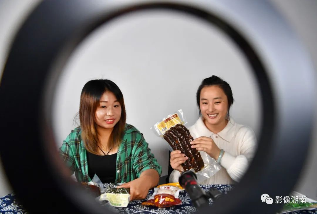 ▲5月27日,永顺县东西部协作孵化中心,工作人员在直播带货。在东西部扶贫协作援助资金的支持下,该县通过打造特色农产品和生鲜电商销售平台,将猕猴桃等特色农产品销往全国各地。湖南日报首席记者 郭立亮 摄