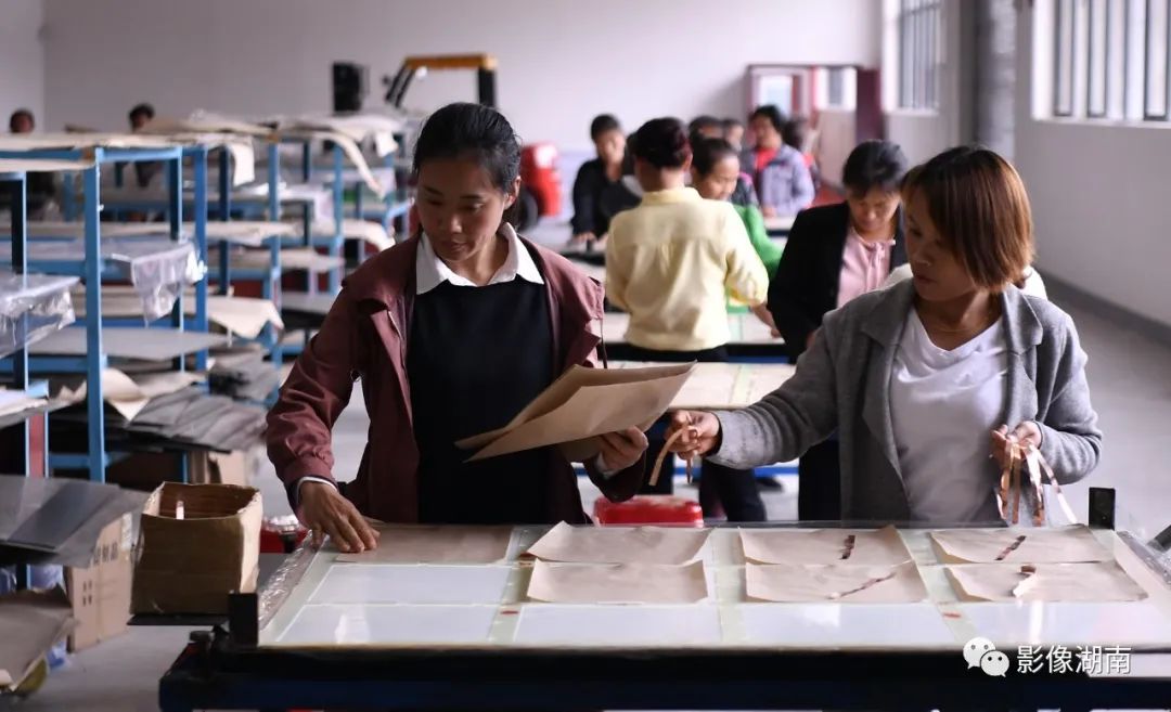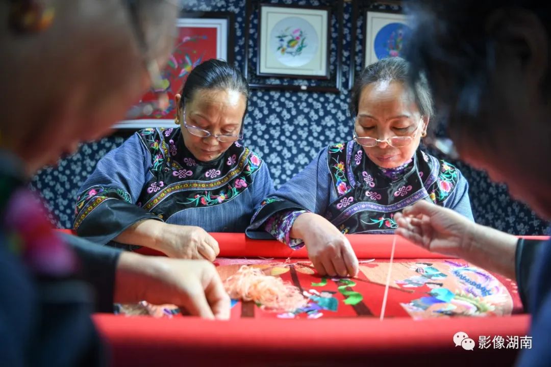 ▲5月26日,花垣县石栏镇七绣坊苗绣扶贫车间,绣娘们正在绣制苗绣作品。该县安排东西部扶贫协作资金建立苗绣扶贫车间,签约绣工486名。湖南日报记者 傅聪 摄