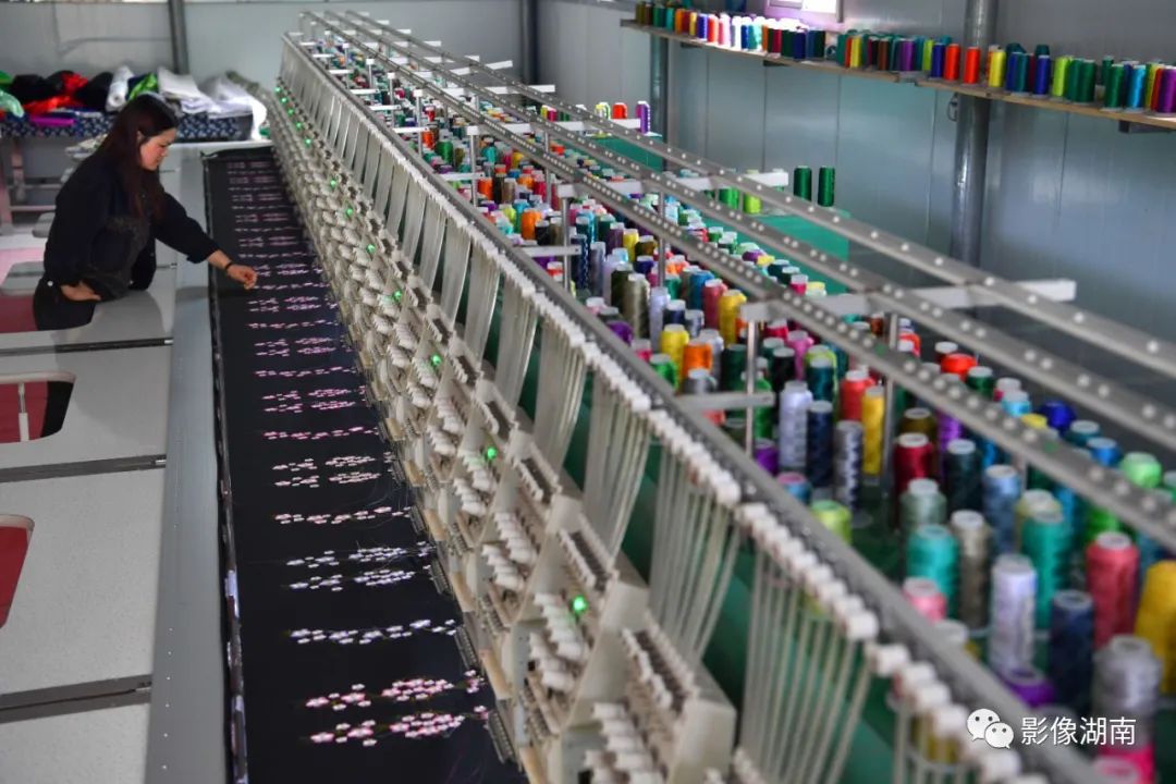 ▲5月26日,花垣县石栏镇七绣坊苗绣扶贫车间,一名绣工操作自动化机械批量制作苗绣产品。湖南日报首席记者 郭立亮 摄