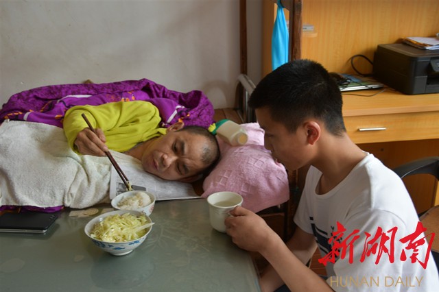 6月21日,父亲节。在新邵县寸石镇财宏村,记者见到蔡亮时,他正在给躺在床上的谢雁军擦拭身体,小小年纪做起事来十分麻利。
