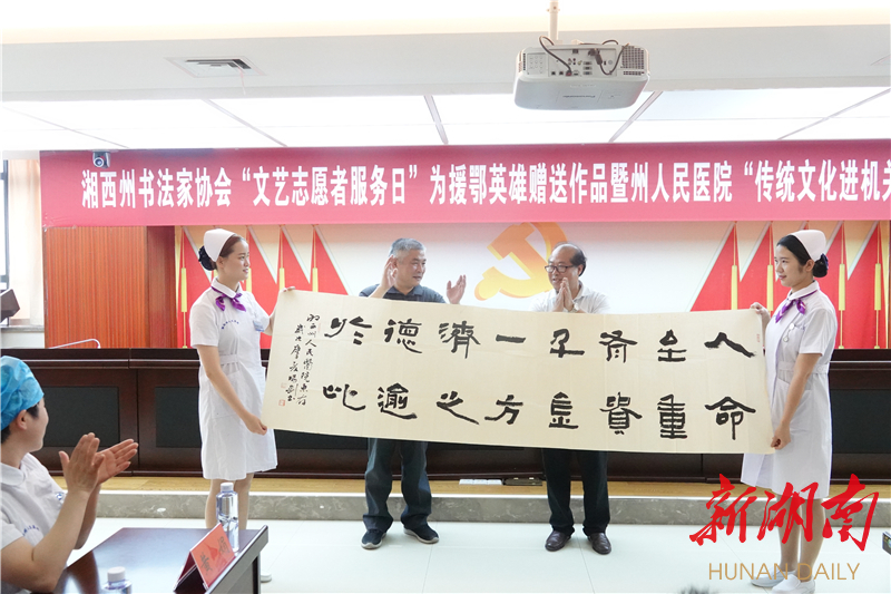 湖南日报·新湖南客户端6月2日讯(记者 徐添 通讯员 陈振华)用文房墨宝向援鄂抗疫英雄致敬。今天下午,湘西土家族苗族自治州书法家协会联合湘西州人民医院,开展“文艺进万家 健康你我他”——到人民中去“中国文艺志愿者服务日” 为湘西州人民医院和援鄂英雄赠送作品暨州人民医院“民族文化进机关”主题活动。