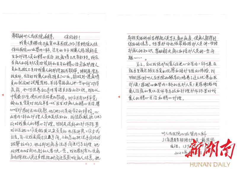 拆开信件,一行行铁画银钩的字体映入眼帘,在其中一张信纸右上角有裂纹却有心地贴了胶贴。这些细节都吸引了我的好奇,见信如见人,写信的人会是什么人,信的内容又是什么?原来,这是一位有着40多年党龄的老党员亲笔手写的一封感谢信。他在信中细数了老伴由于急性心力衰竭,病情危重从外院转入我院心血管内二科医治,在住院20多天里,通过自己眼见为实的观察和亲身体验的感受,真切感受到了年青一代医护人员的责任与担当,对此感到无比的欣慰。作为陪伴在左右的家属,他用心亲手写了这封简短而真切的感谢信,他衷心感谢住院科室医护人员对其老伴的精心治疗和贴心照顾,真挚的情感跃然于纸上。他提到,在医院得到了及时有效的治疗和精心的护理,以及亲人般的关怀与照顾,心中深感安慰和温暖。