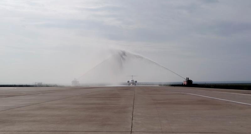 飞机落地锡林浩特,当地机场用民航界最高礼遇“过水门”庆祝国航ARJ21飞机首航成功。陈灏摄