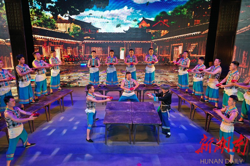 (7月23日晚,凤凰县山江镇《苗寨故事》演出,苗族传统风俗和技艺吸引游人。湖南日报首席记者 郭立亮 摄)