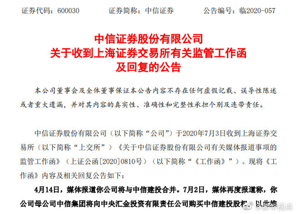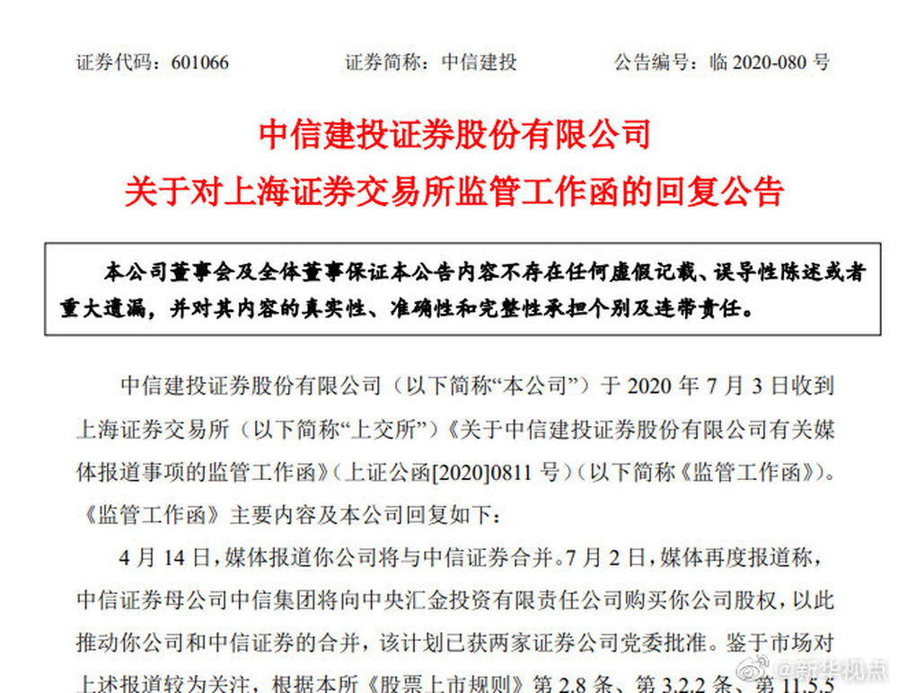 中信证券和中信建投回复监管函再次澄清合并传闻