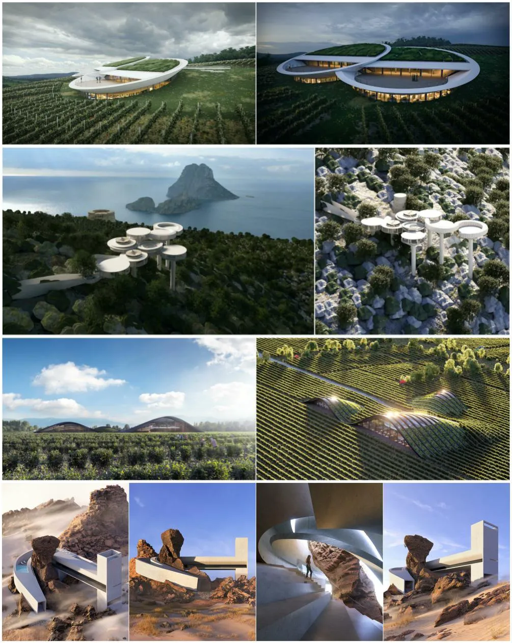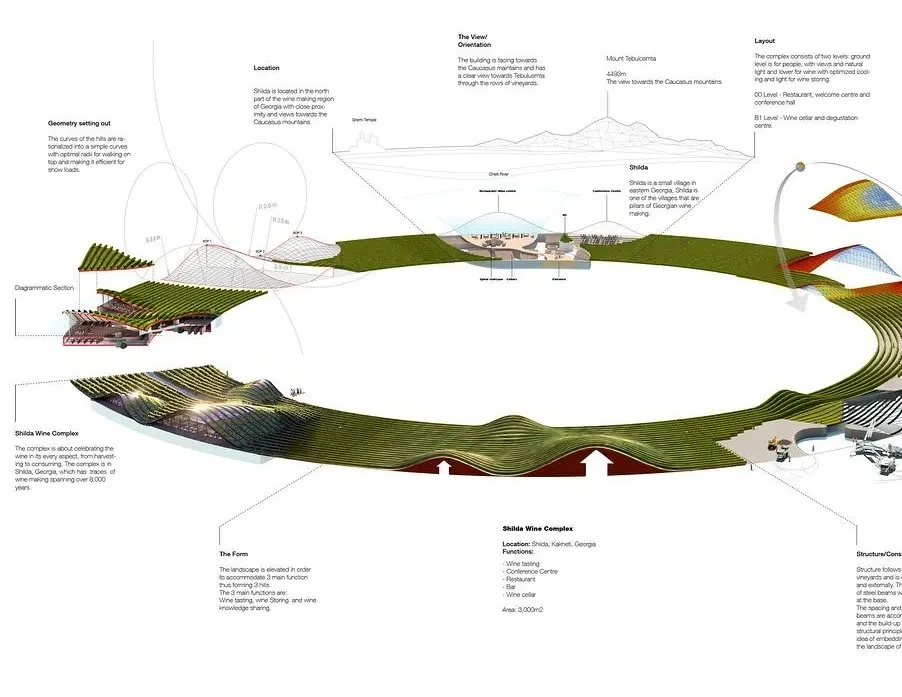 该设计综合考量了该地区的环境因素以及葡萄酒质量问题,并且利用土壤中的热量与太阳能来调节内部的温度,来保证葡萄酒的完好储存。