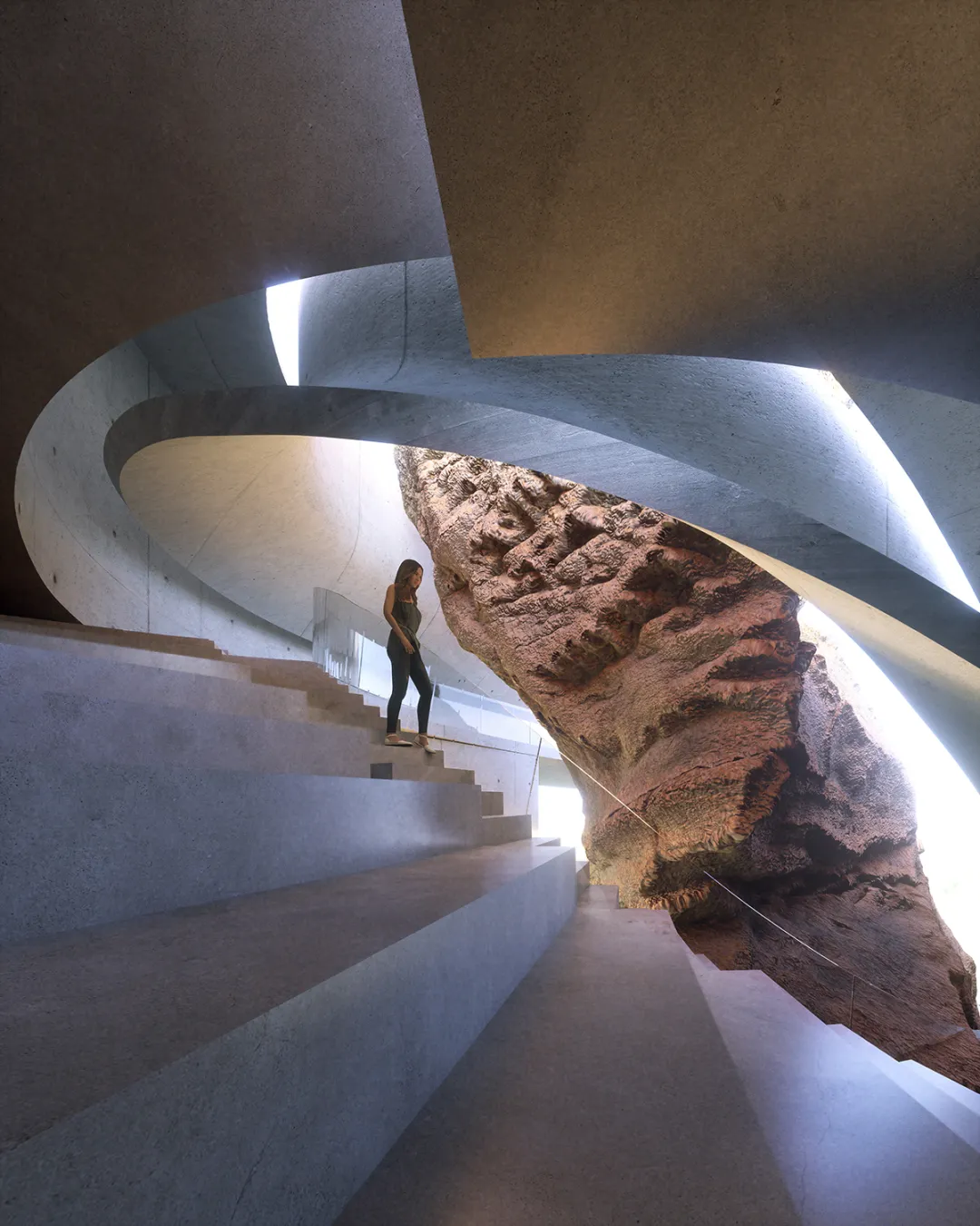 建筑的设计体现了“建筑的竖向结构与竖向岩层相对立”的双重性。两者虽然高度相同,但是有一个是粗糙的天然岩石、被风雨侵蚀了几百几十万年,而另一个则是光滑的、人造的异形混凝土的建筑物,因此,双方的结合显得异常迷人。