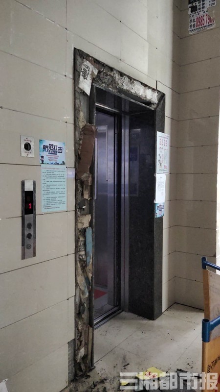 三湘都市报记者赶到事发地,小区二单元南北各有一台电梯,相距约3米,发生瓷砖脱落的是南侧电梯。现场破碎的瓷砖已经被清理干净,破损的电梯门框抹上了水泥。