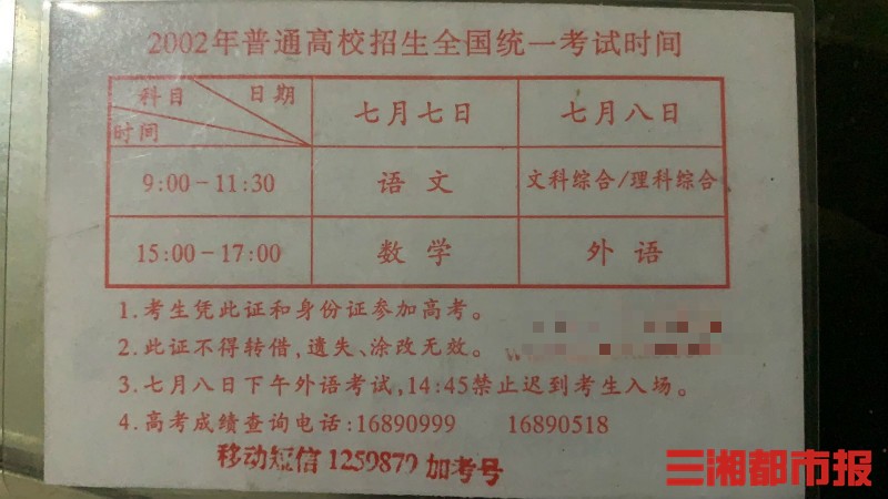 今年高考推迟到7月7日-8日,2002年参加高考的彭玮婧找到了自己珍藏了18年的准考证,发现各科考试安排和当年一模一样。“一切就好像一个轮回!”当时就读于长沙市一中的她,成为18年前最后一批7月高考生,这么多年,那段为梦想打拼的记忆仍然清晰可见。