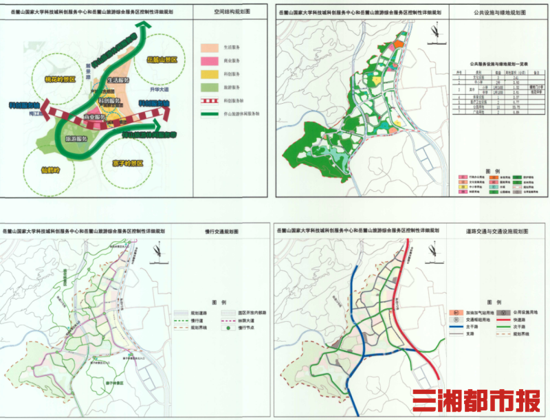 岳麓山国家大学科技城科创服务中心和岳麓山旅游综合服务区如何规划发展?规划形成“两横三纵”的干路网骨架、构建“秀水串景““长藤串瓜”绿地生态系统、沿桃花岭、仙鹤岭、寨子岭山麓打造“伴山旅游休闲服务带”……