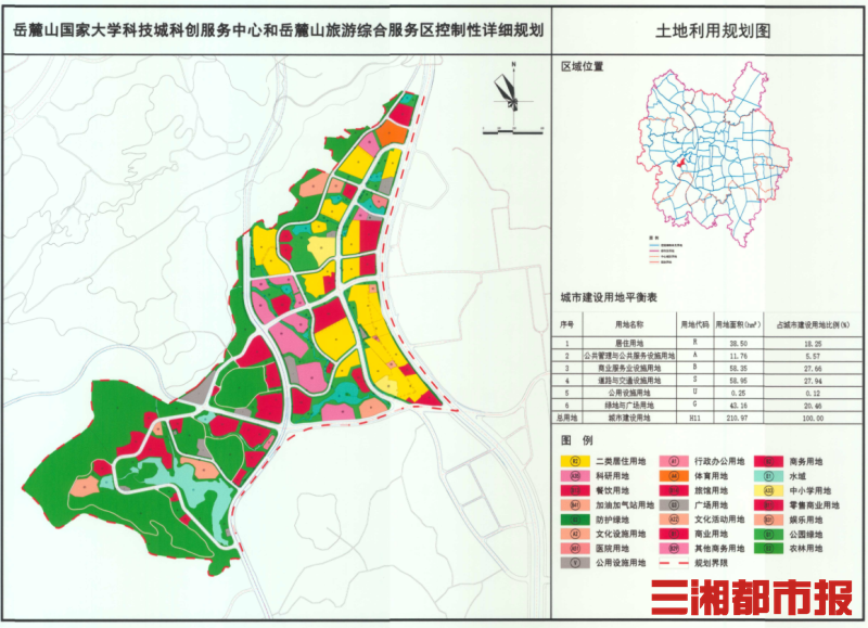 7月3日起,长沙市自然资源和规划局对岳麓山国家大学科技城科创服务中心与岳麓山旅游综合服务区控制性详细规划进行批前公示,涉及功能定位和规模、空间结构和用地布局、绿地系统规划、公共服务设施规划及交通规划等内容。