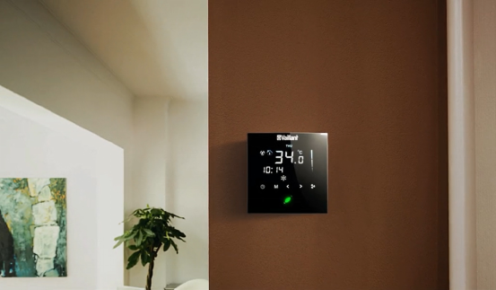 一个配备人体感应技术的温控器面板,就能实现复杂系统一键操作。当能人儿接近屏幕时,屏幕自动亮起,无需操作时,温控器暗屏运行。科技感十足,还将节能进行到底。