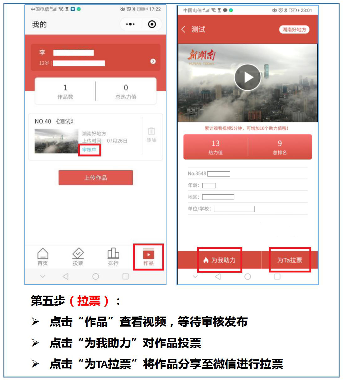 第五步:点击“作品”,等待视频审核发布。视频发布成功后,可点击“为我助力”进行投票,点击“为TA拉票”进行分享、拉票。