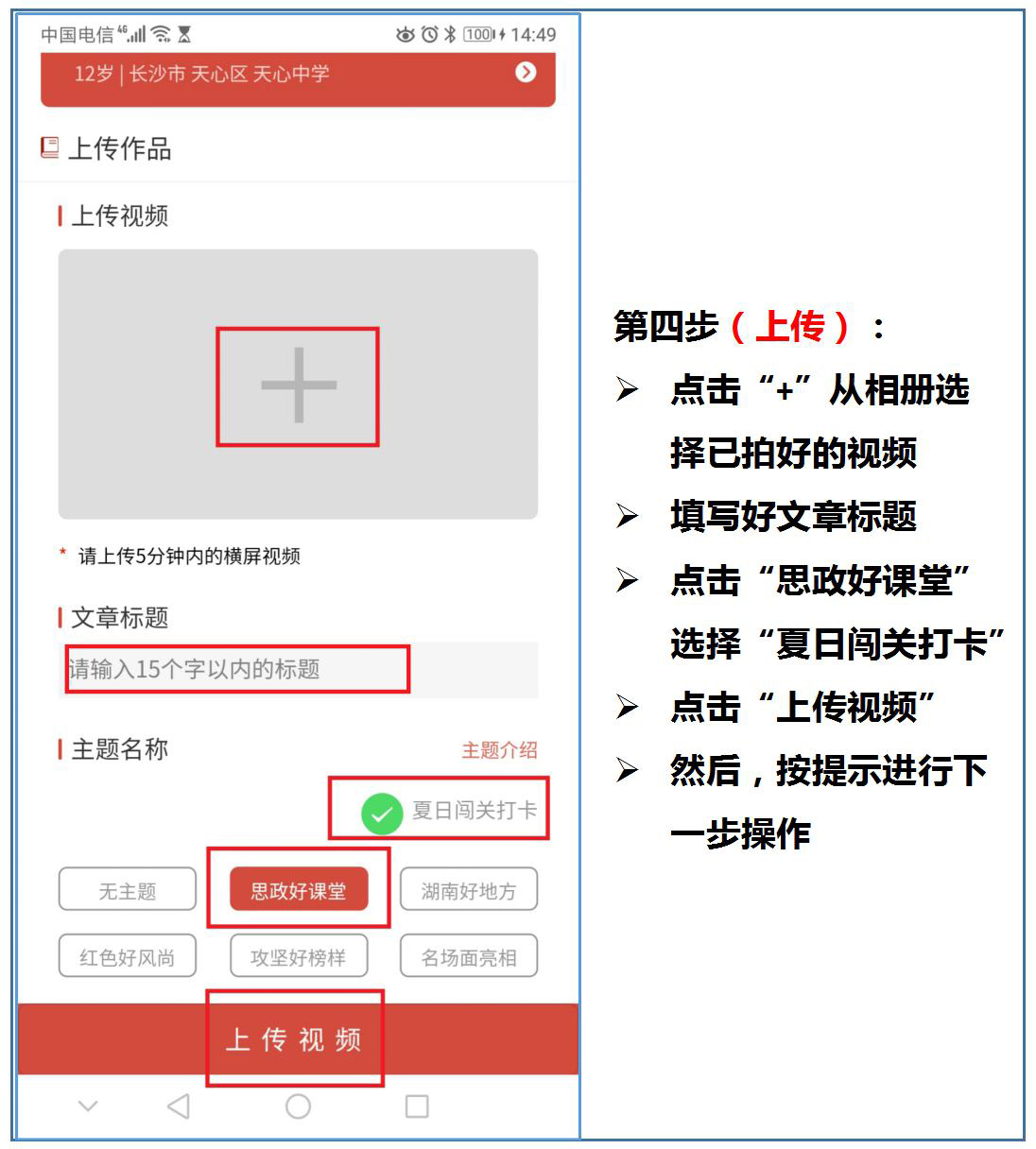 第四步:点击“+”从相册选择已拍摄好的视频,填好文章标题,选择主题“思政好课堂”-“夏日闯关打卡”后,上传视频。