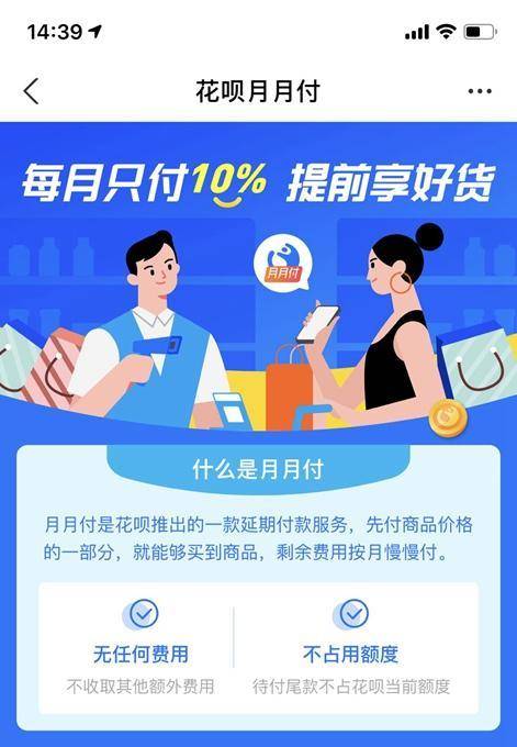 亦醒表示,与花呗分期不同的是,花呗月月付按月付款,不会按订单总额占用花呗额度。“举例来说,用户想要购买一门5000元的教育课程,用月月付分10个月付款的话,只需要当前有500元花呗额度就能完成购买,接下来每个月自动付500元。”