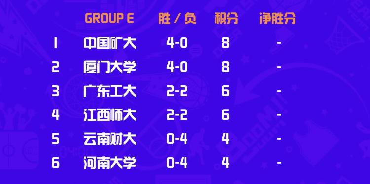 分在E组的球队有广东工业大学、厦门大学、江西师范大学、中国矿业大学、河南大学、云南财经大学。