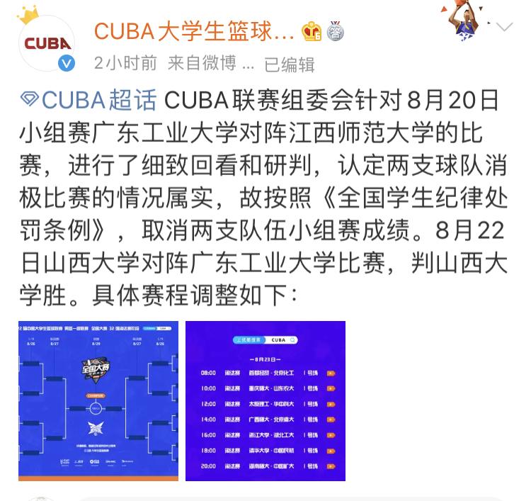 今早中国大学生篮球联赛(CUBA)官方发表公告:组委会针对8月20日小组赛广东工业大学对阵江西师范大学的比赛,进行了细致回看和研判,认定两支球队消极比赛的情况属实,故按照《全国学生纪律处罚条例》,取消两支队伍小组赛成绩。