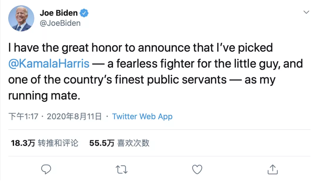 8月11日,民主党籍总统候选人、前副总统拜登(Joe Biden)宣布,他选择加州国会参议员卡玛拉·哈里斯(Kamala Harris),中文名贺锦丽,作为竞选搭档。后者成为首位被选作副总统人选的非裔及亚裔美国人。