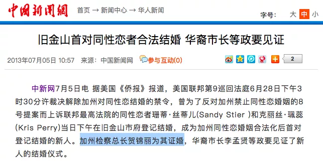 2013年,旧金山首对同性恋者结婚仪式上,贺锦丽为其证婚。图源:中新网