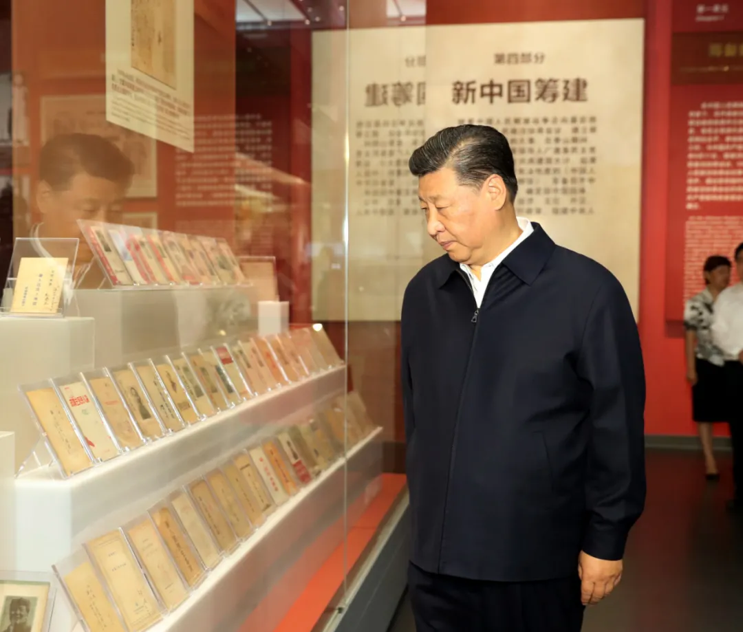 2019年9月12日,中共中央总书记、国家主席、中央军委主席习近平视察中共中央北京香山革命纪念地。这是习近平在香山革命纪念馆参观《为新中国奠基》主题展览。新华社记者 黄敬文 摄