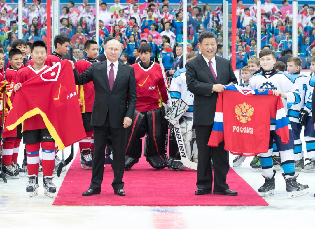 2018年6月8日,国家主席习近平同俄罗斯总统普京在天津体育馆共同观看中俄青少年冰球友谊赛。两国元首同小队员们亲切交谈、合影,并共同为比赛开球。新华社记者 庞兴雷 摄