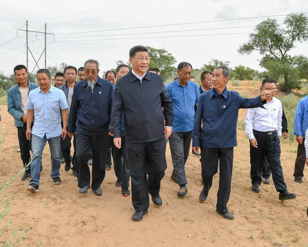 2019年8月19日至22日,中共中央总书记、国家主席、中央军委主席习近平在甘肃考察。这是21日上午,习近平在武威市古浪县八步沙林场同“六老汉”代表及林场职工亲切交谈。新华社记者 谢环驰 摄