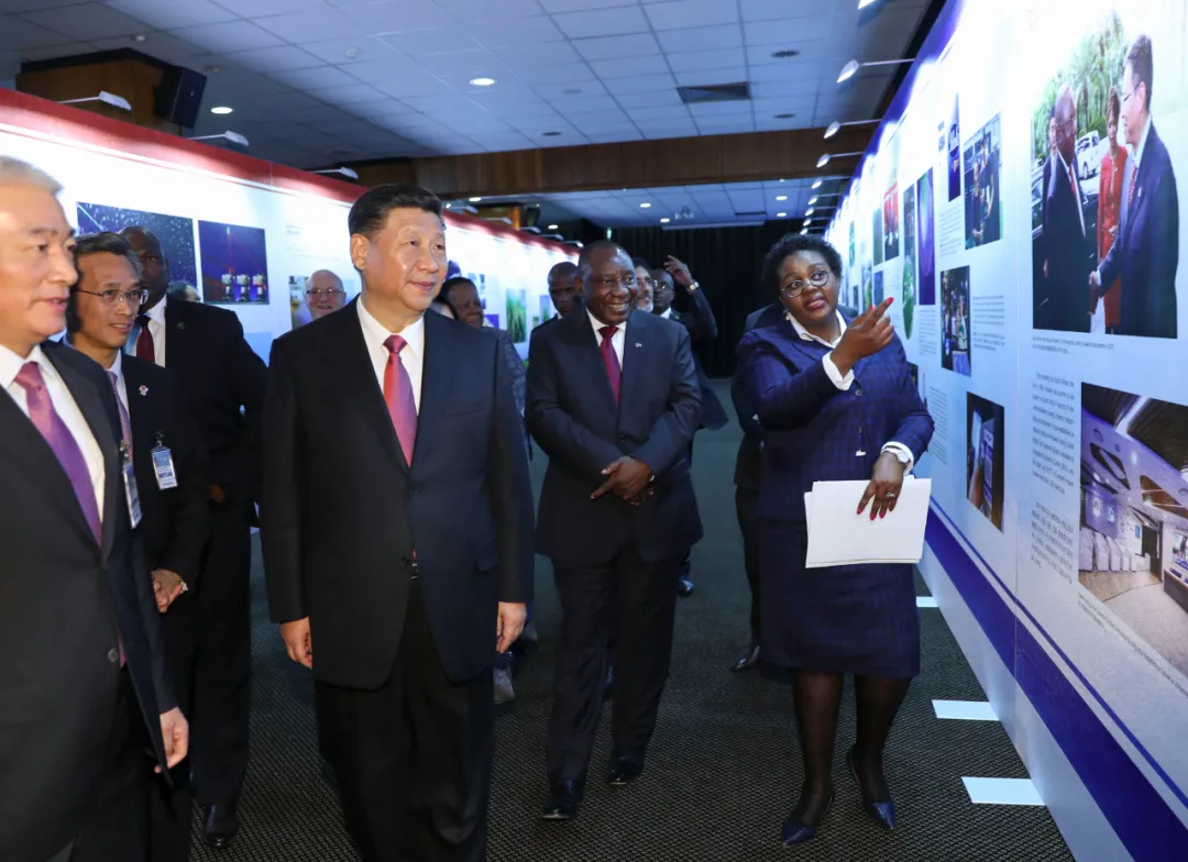 2018年7月24日,国家主席习近平和南非总统拉马福萨在比勒陀利亚一道出席中南科学家高级别对话会开幕式。这是开幕式前,习近平和拉马福萨共同参观中南科技创新合作成果图片展。新华社记者 谢环驰 摄