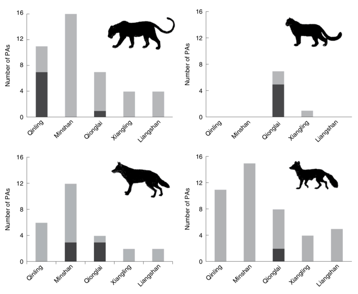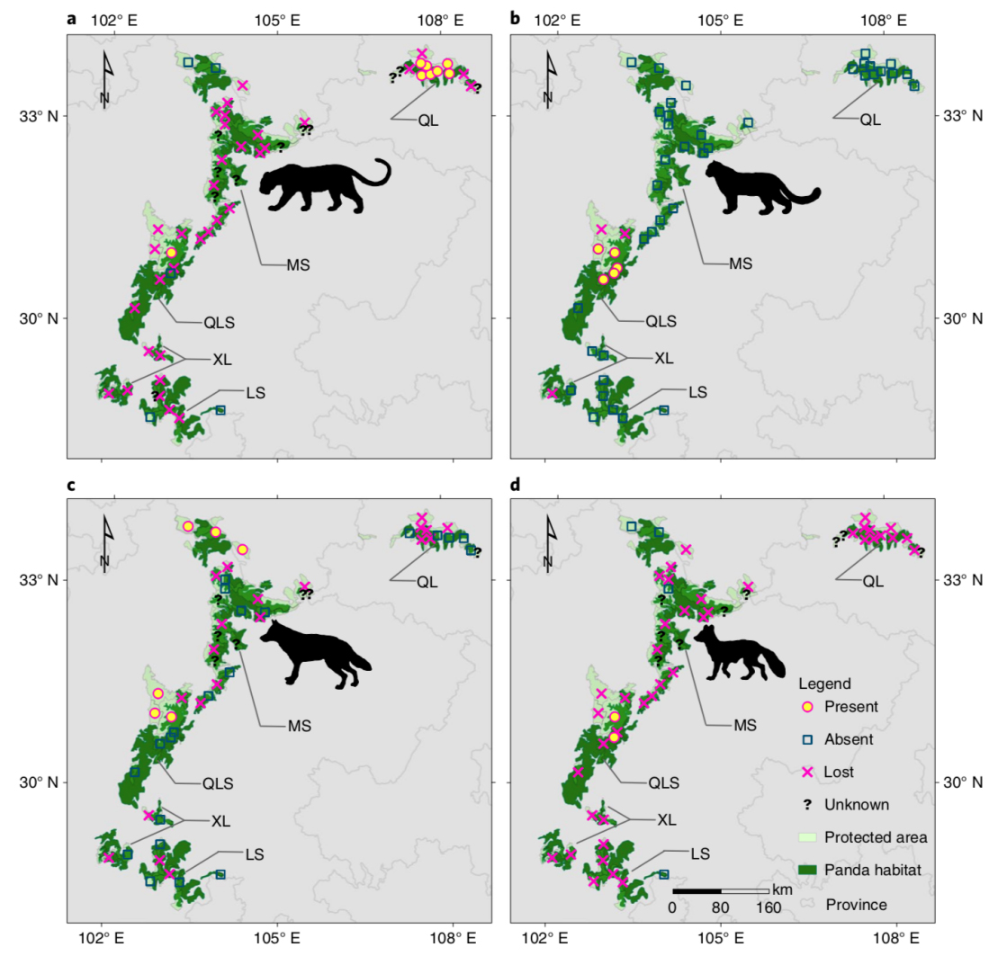 研究称,自中国的大熊猫保护区在50-60年前初次设立以来,这4个物种在大部分保护区中都难觅踪影。其中,豹(Panthera pardus)从81%的保护区中消失了,雪豹(P. uncia)从38%的保护区消失,狼(Canis lupus)从77%的保护区消失,豺(Cuon alpinus)从95%的保护区消失。这一发现警示,不应过度依赖于单一物种保护政策来保护某地区的生物多样性。