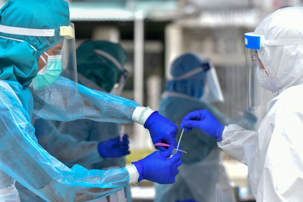 5月10日,医护人员在马来西亚雪兰莪州一处因新冠疫情而封锁的小区内处理采集到的样本。新华社发(张纹综摄)