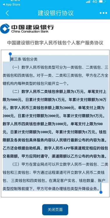 在曝光的《中国建设银行数字人民币钱包个人客户服务协议》中,记者看到,数字人民币钱包服务内容包括:开立或注销、现金兑换、从账户兑出、兑回到账户、转款、挂失、升降级、绑定银行卡及小额免密服务等9大功能。此外,建行的数字人民币钱包还对用户账户进行了分类。数字人民币钱包类型可分为一类钱包、二类钱包、三类钱包和四类钱包。对于一类、二类和三类钱包,用户在建设银行全辖机构内每种类型的钱包只能开立一个。用户通过远程渠道可开立数字人民币二类钱包、 三类钱包和四类钱包。一类钱包需要到营业网点进行办理。