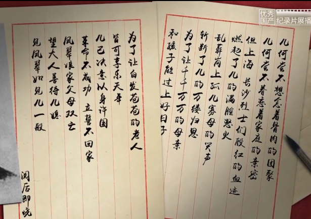 王尔琢来到相约之地,却是人去楼空。读到妻子的信,王尔琢满怀歉疚,他当即拿起笔,给父亲写下了一封情真意切的信:“凤翠母女此次来汉,未谋一面,深为憾事。儿何尝不想念着骨肉的团聚,儿何尝不眷恋着家庭的亲密,但上海、长沙烈士们殷红的血迹燃起了儿的满腔怒火,乱葬岗上孤儿寡母的哭声斩断了儿的万缕归思。为了让千千万万的母亲和孩子能过上好日子,为了让白发苍苍的老人皆可享乐天年,儿已决意以身许国!革命不成功,立誓不回家。凤翠娘家父母双亡,望大人善待儿媳,见凤翠如见儿一般……”