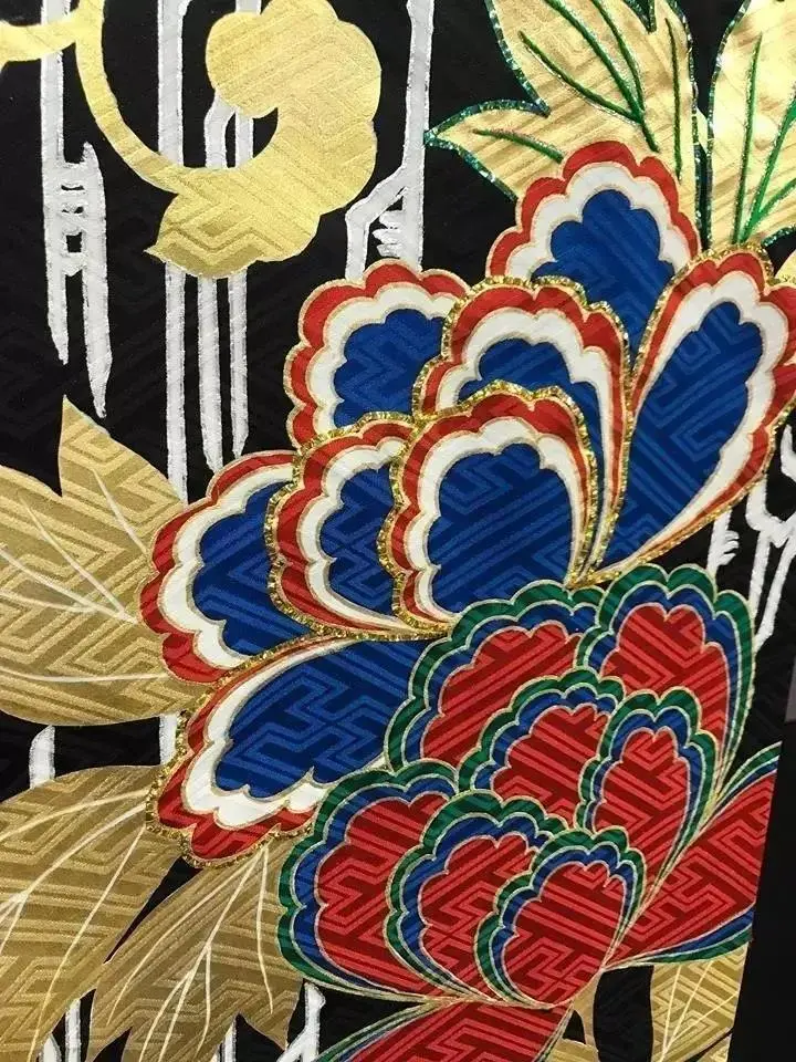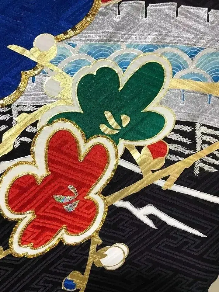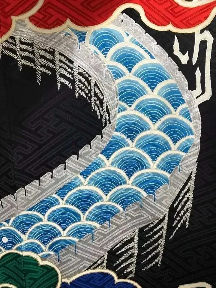 中国和服的底色为庄重大气的玄色主图案布局是明清两朝十分流行的“江崖海水”纹样