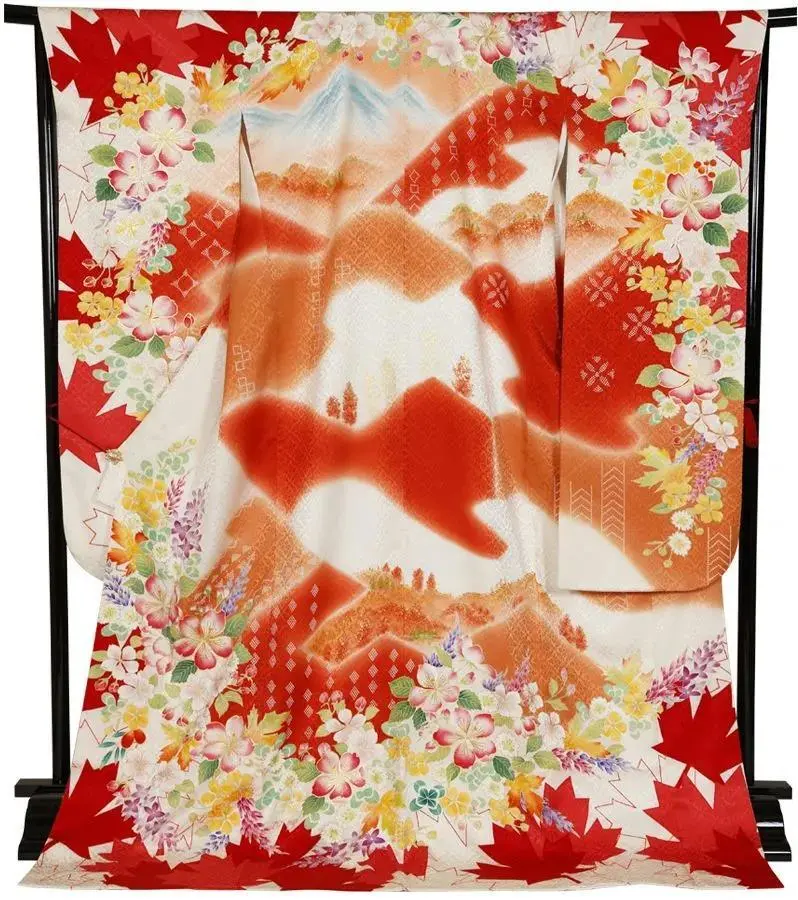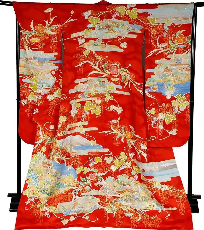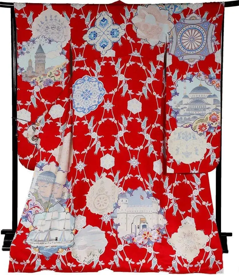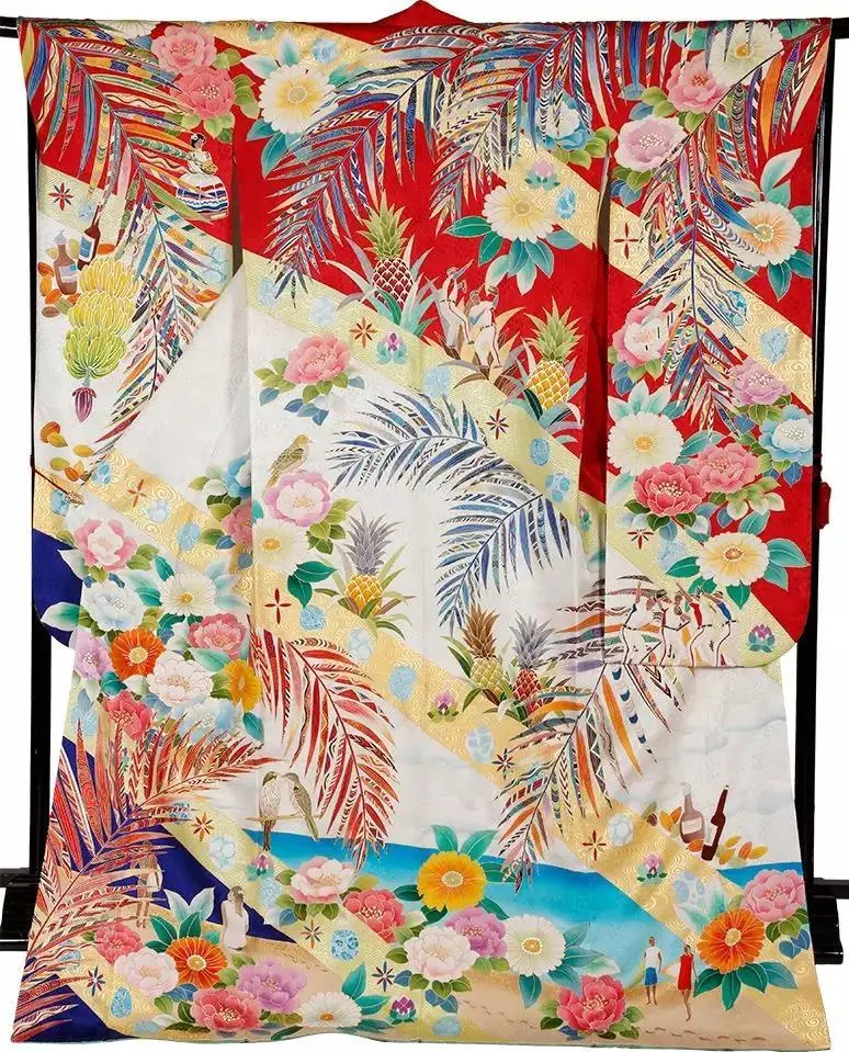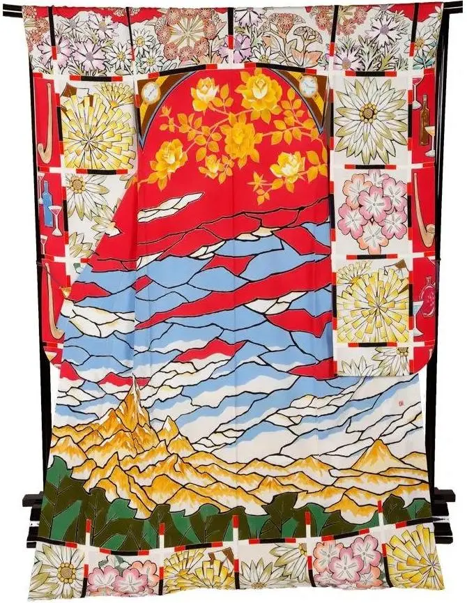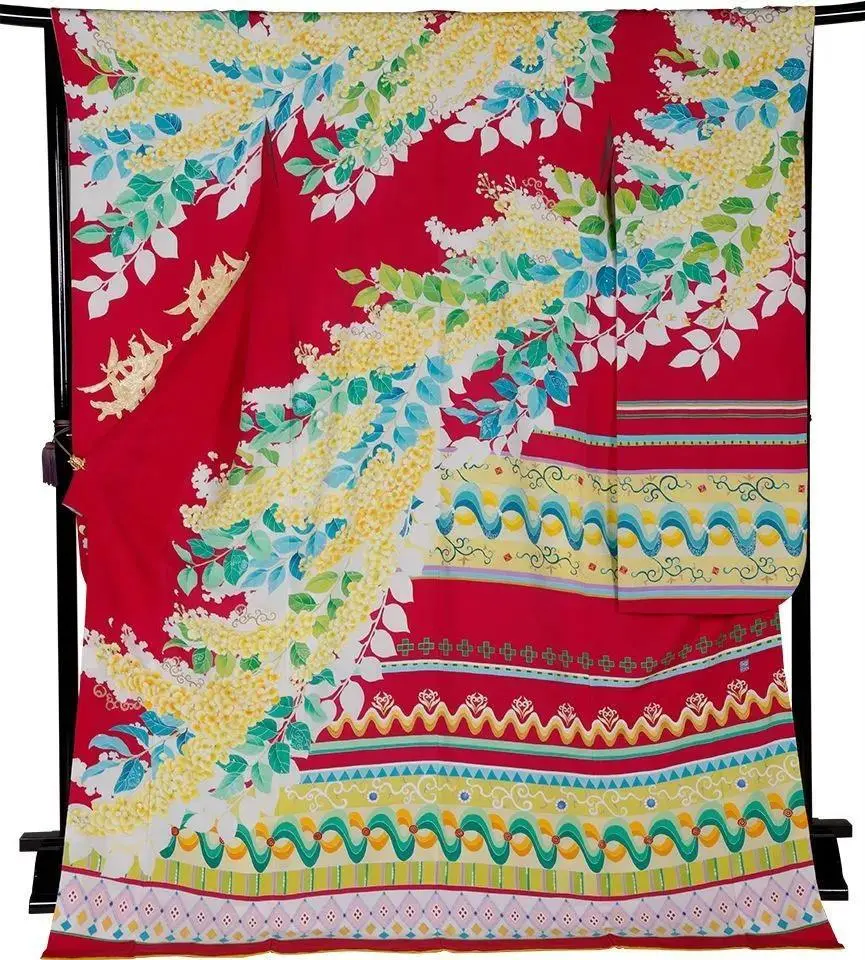 日本和服在红白两色基调上装饰了47个都道县府的花