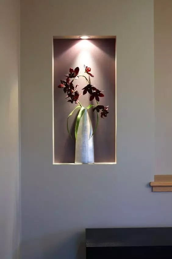 如果嫌弃正对大门空空的墙面觉得没有情调,制作壁龛、安装几盏小壁灯、放上精心挑选的装饰品,情调马上营造出来,推门进屋就是满满的好心情。