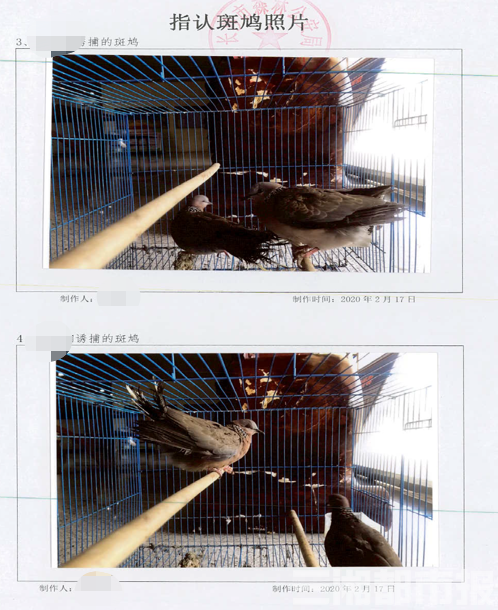 “我在空笼子里放了一些米,再把铁笼子门往上拉,然后用一根小木棍子顶住铁笼子的门。等斑鸠进入铁笼子吃米的时候,就会将小棍子碰倒,门自然就关上了。”赵某说,从2019年5月到9月,他用这种方法先后捕获了4只斑鸠,通过喂米和水来饲养。