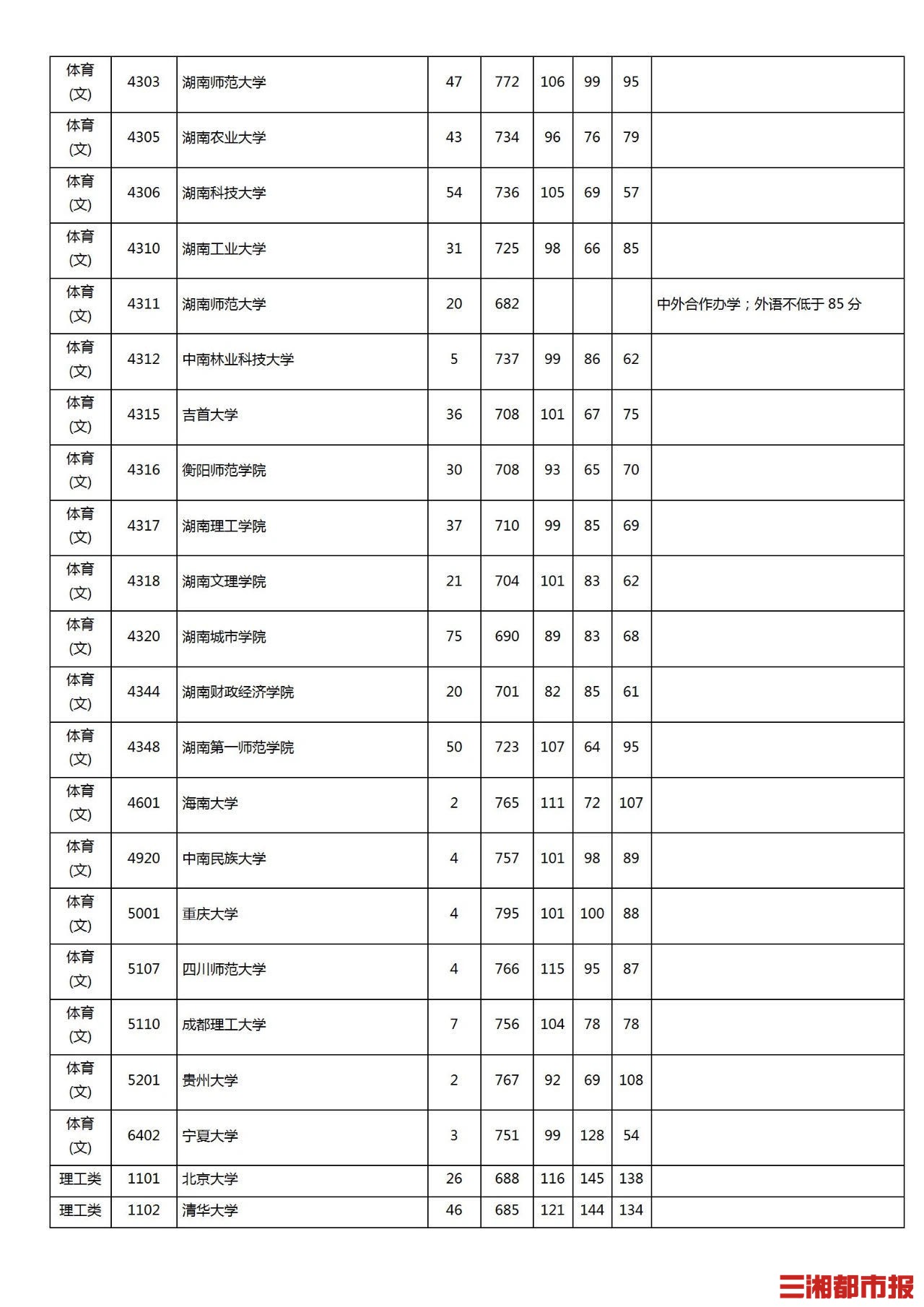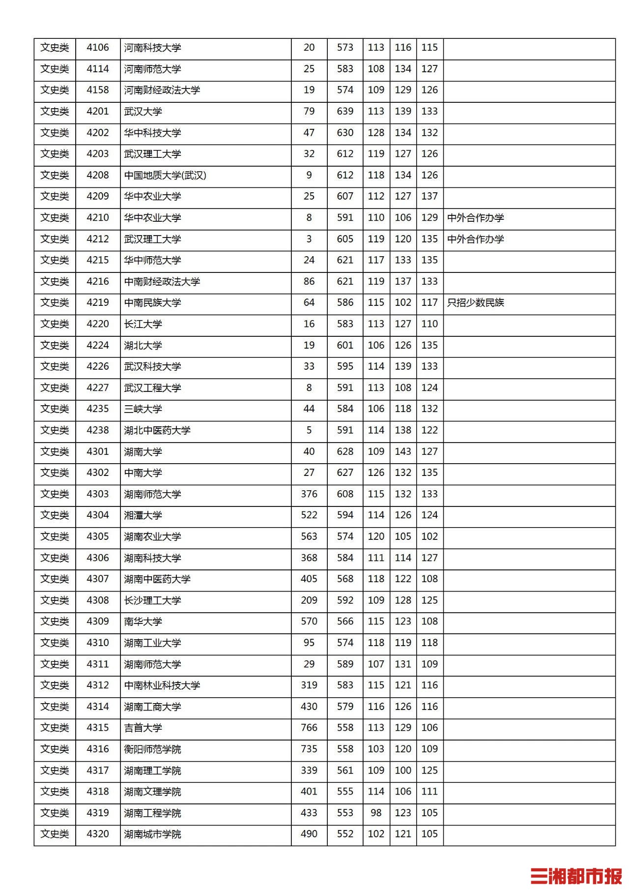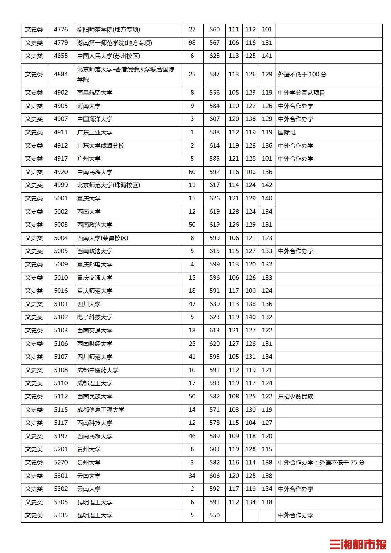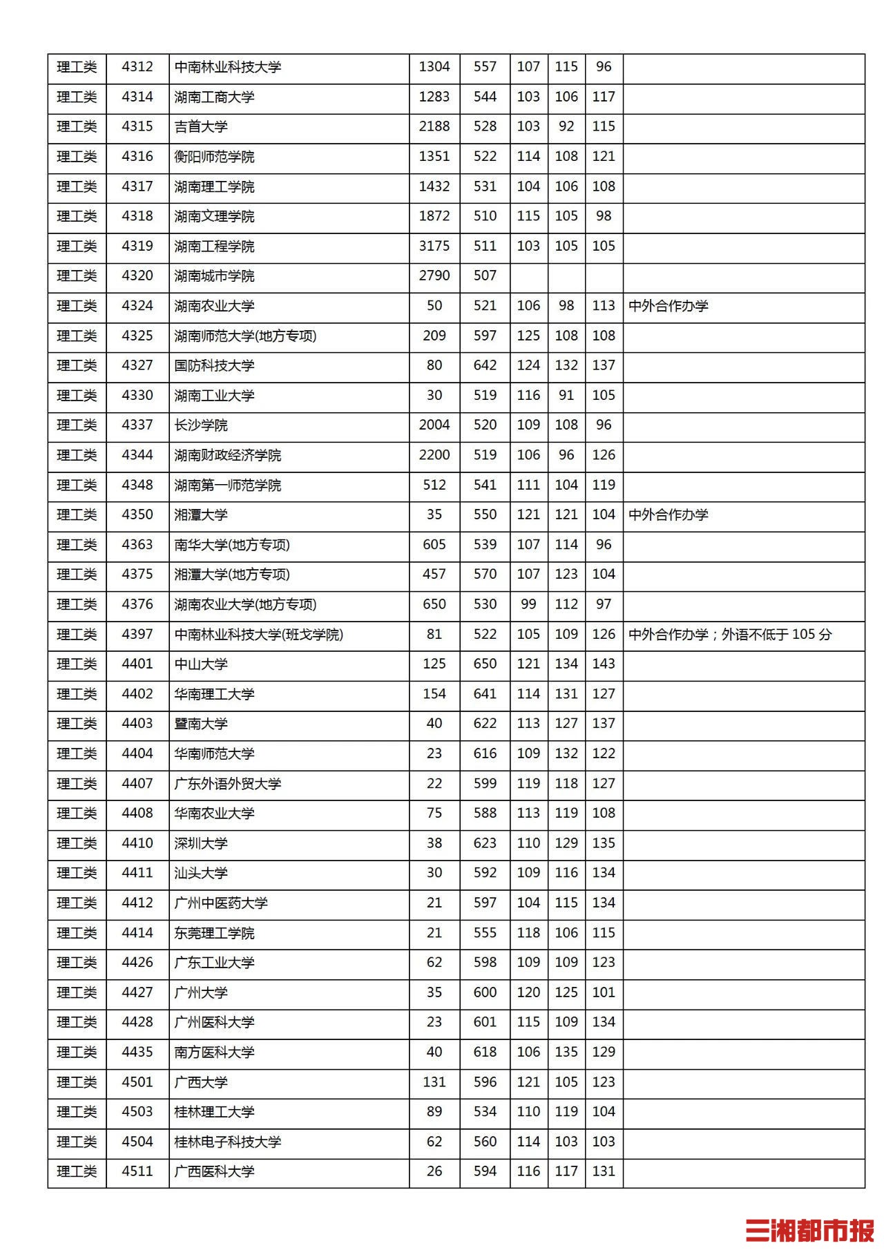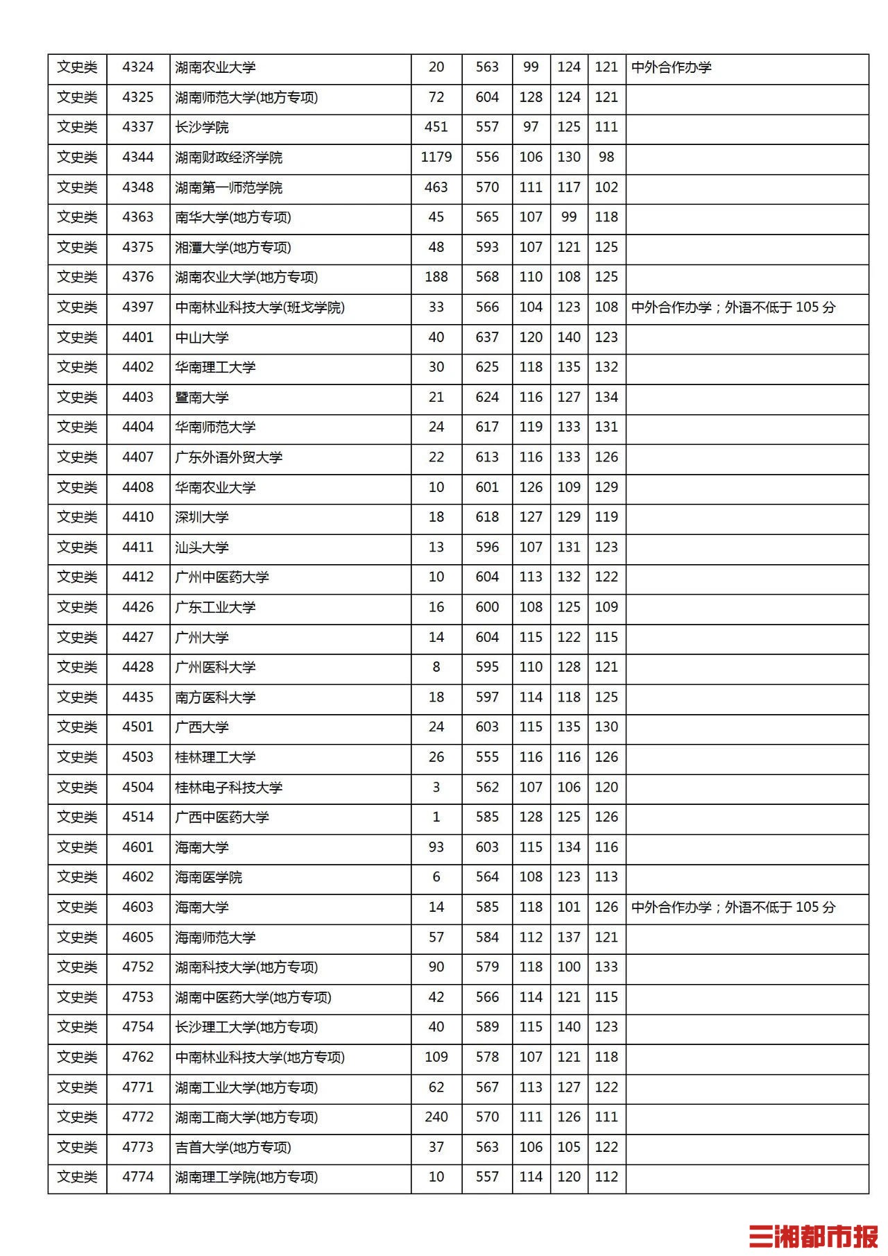 省内高校中,位列文科前五位的高校分别是:湖南大学628分,中南大学627分,湖南师范大学608分,湘潭大学594分,长沙理工大学592分;理科前五位的高校分别是:国防科技大学642分,中南大学636分,湖南大学628分,湖南师范大学606分,长沙理工大学579分。