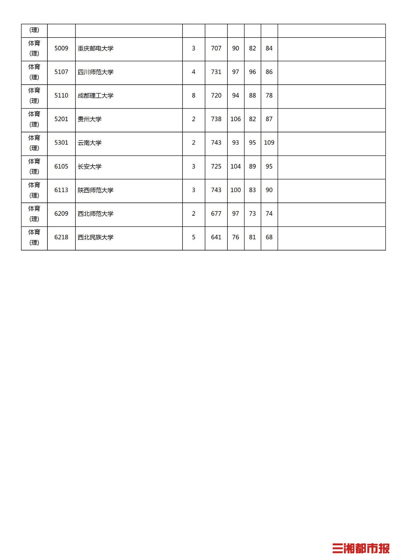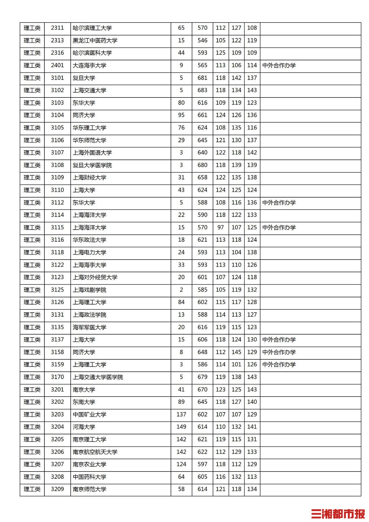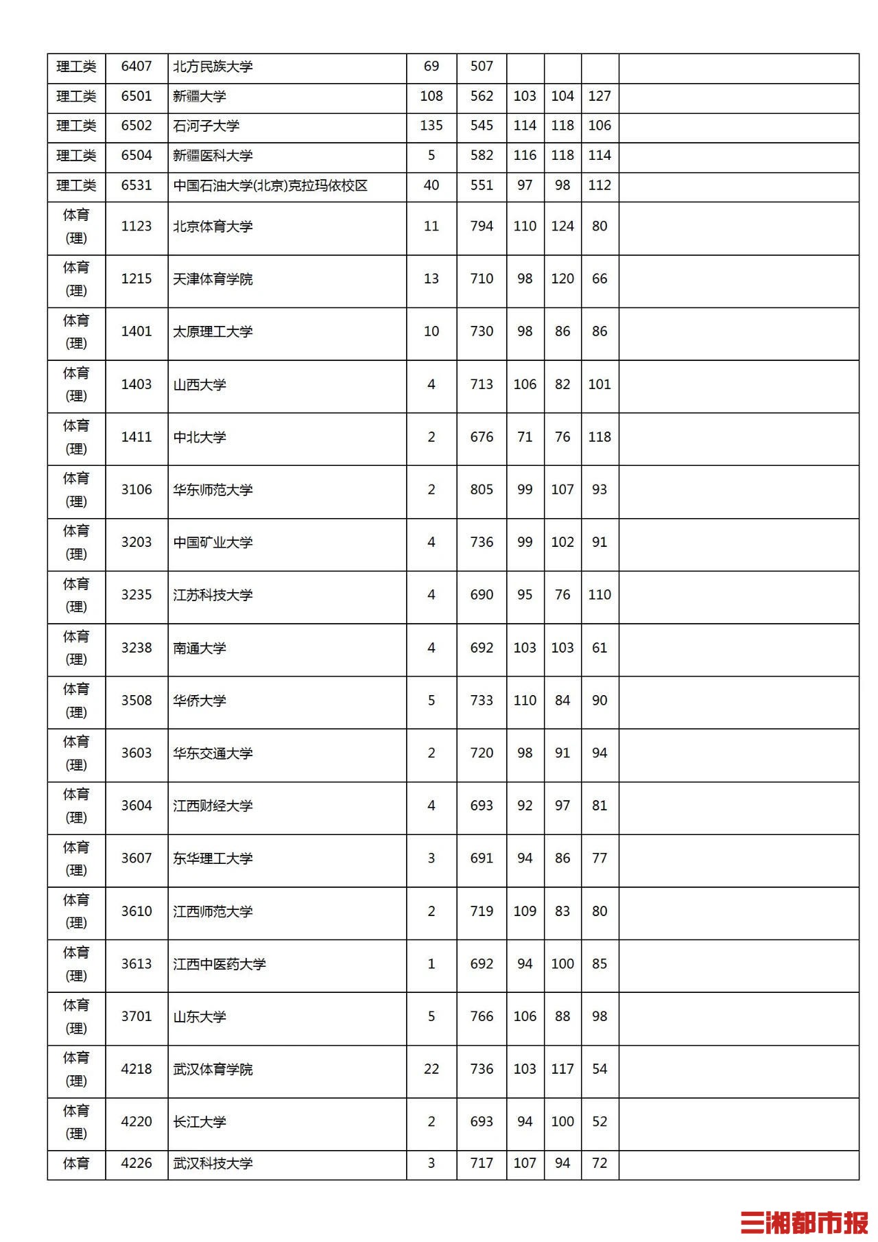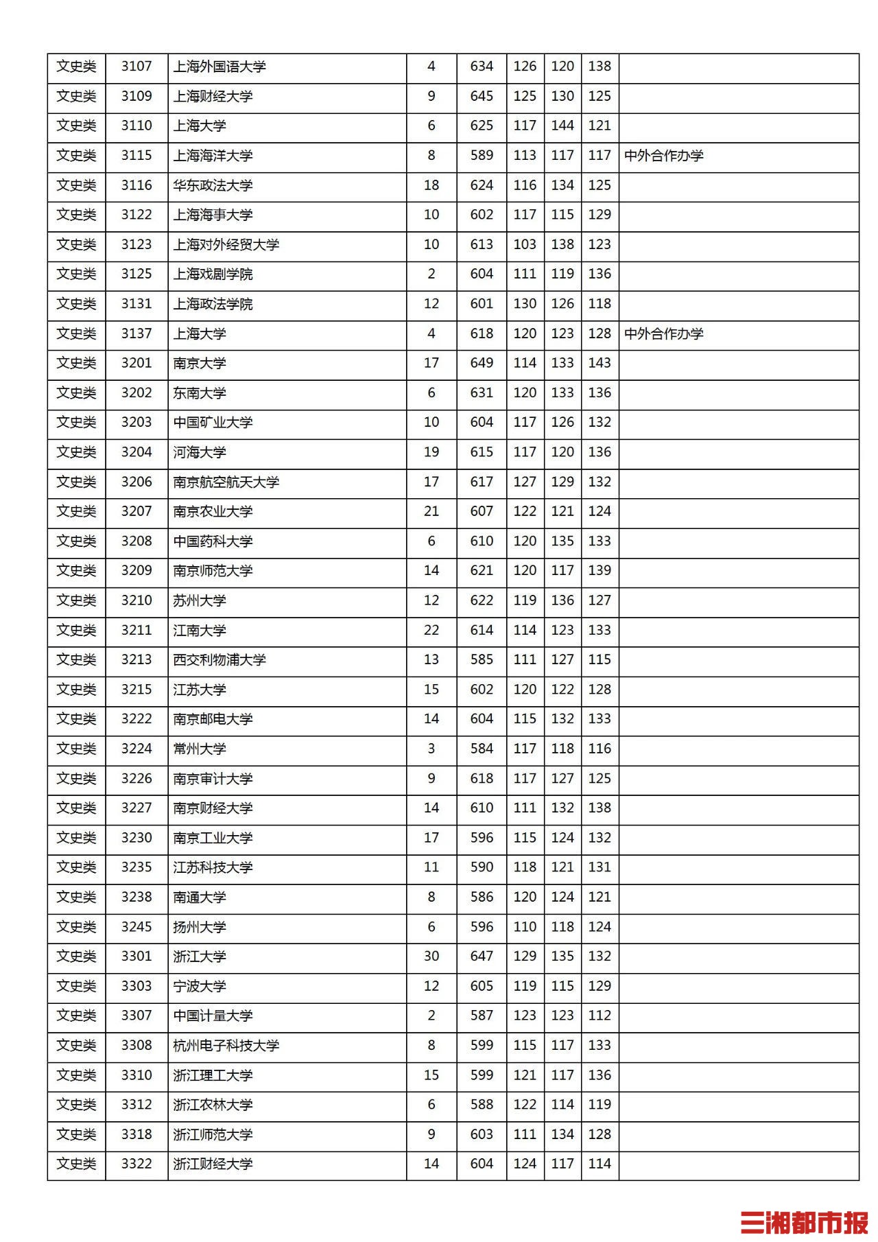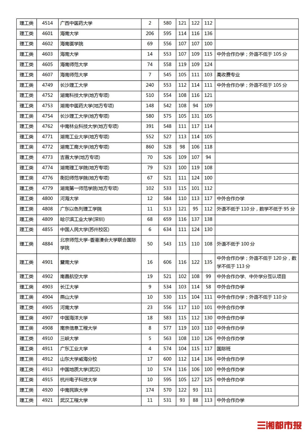 省内高校中,位列文科前五位的高校分别是:湖南大学628分,中南大学627分,湖南师范大学608分,湘潭大学594分,长沙理工大学592分;理科前五位的高校分别是:国防科技大学642分,中南大学636分,湖南大学628分,湖南师范大学606分,长沙理工大学579分。