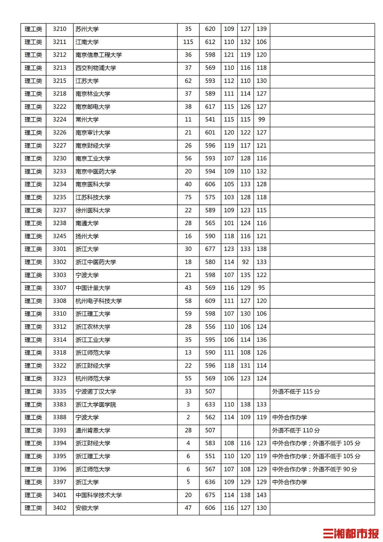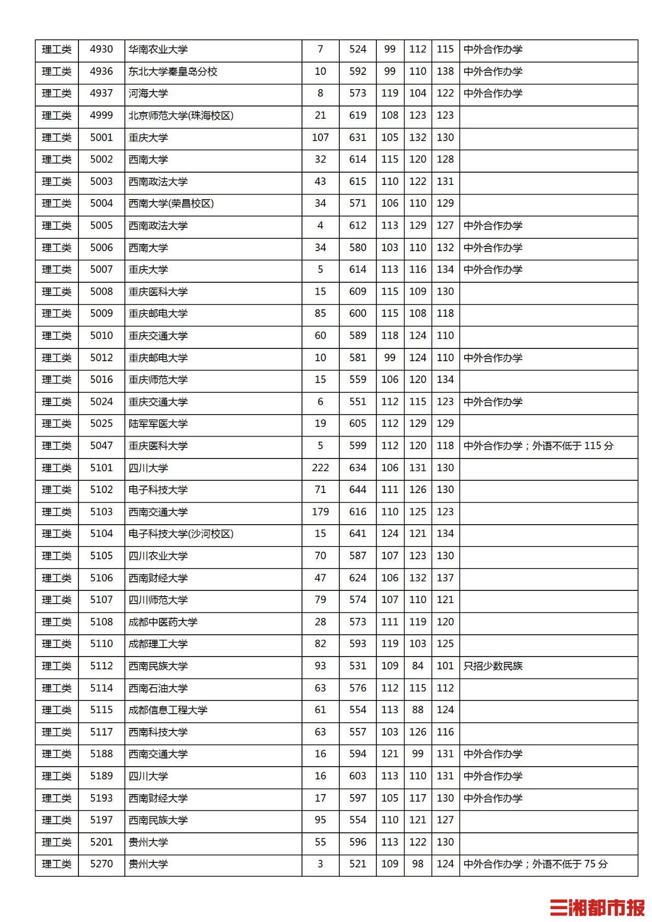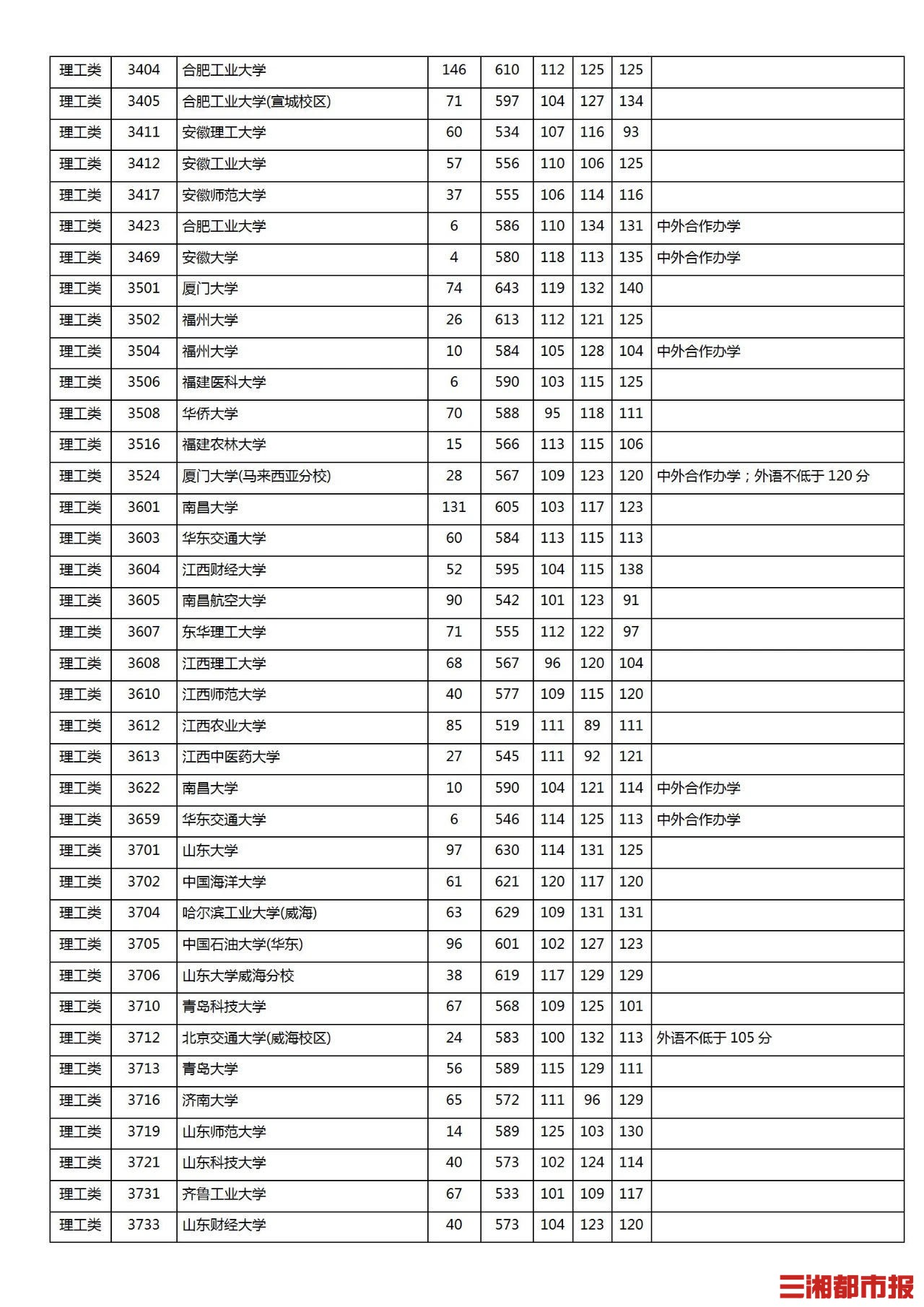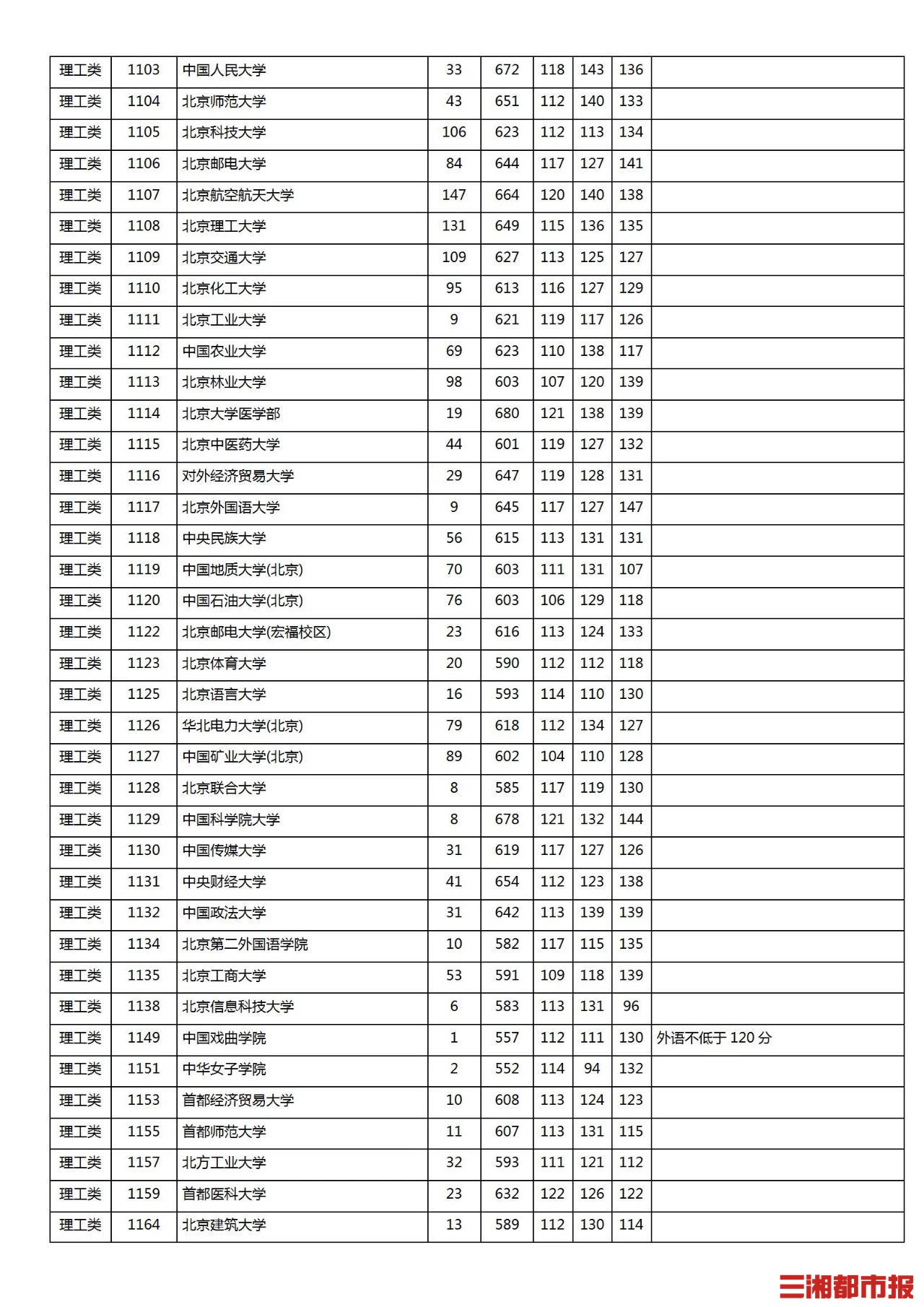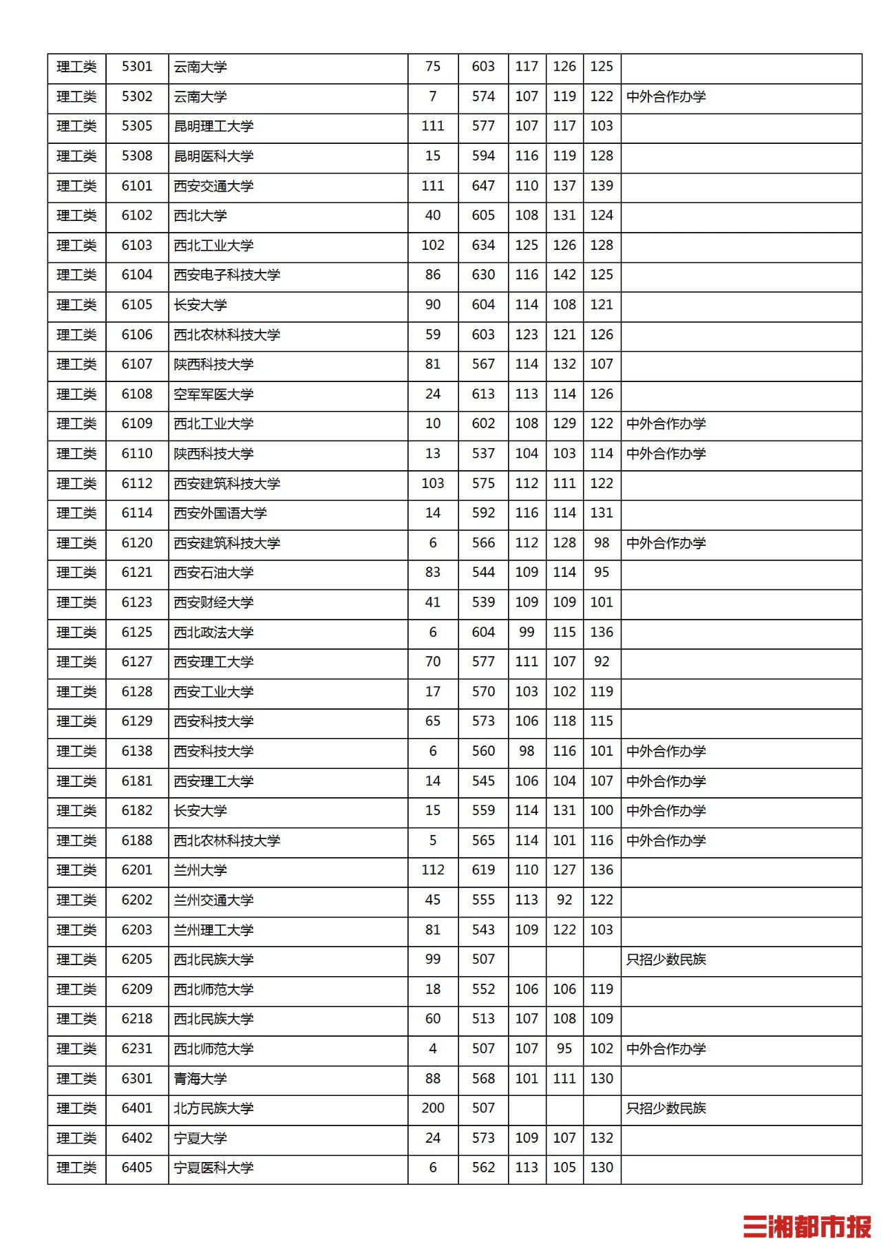 省内高校中,位列文科前五位的高校分别是:湖南大学628分,中南大学627分,湖南师范大学608分,湘潭大学594分,长沙理工大学592分;理科前五位的高校分别是:国防科技大学642分,中南大学636分,湖南大学628分,湖南师范大学606分,长沙理工大学579分。