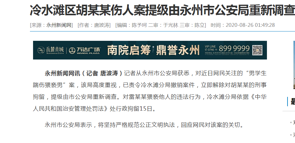 原标题:冷水滩区胡某某伤人案提级由永州市公安局重新调查