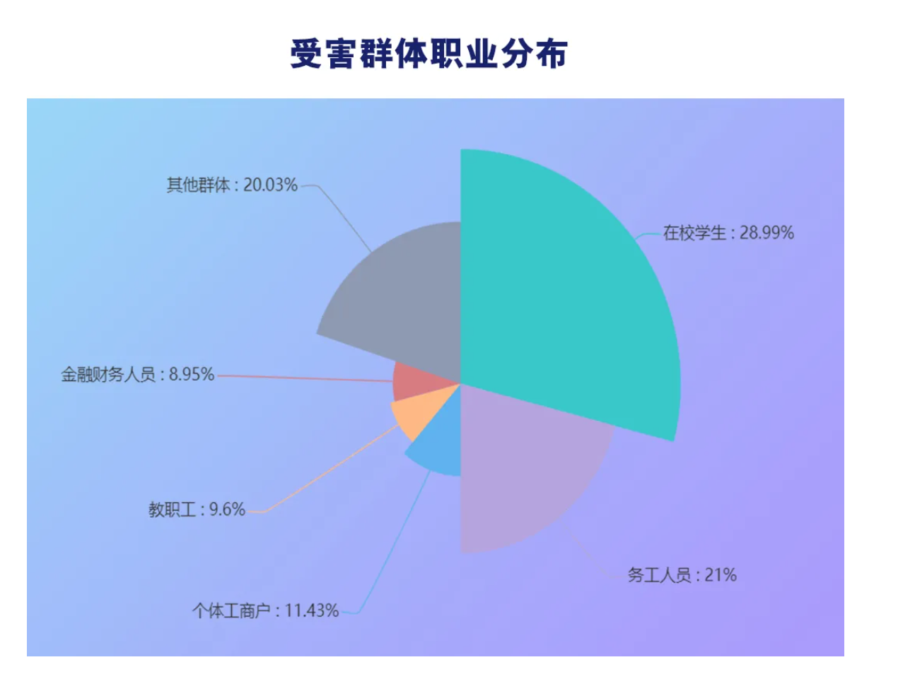 从受害群体年龄分布看,长沙18岁-50岁年龄阶段为主要受害群体,占比80%以上。从受害群体职业分布看,学生与务工人员为主要受害群体。其他受害群体还有个体工商户、教职工、金融财务人员等。
