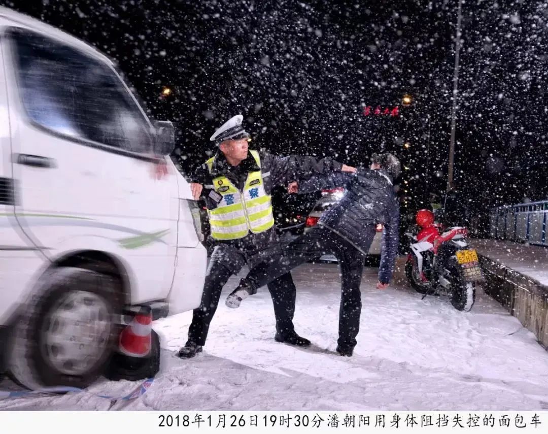 2018年1月26日19时30分,因冰雪低温天气,湘潭市莲城大桥桥面大面积结冰,连续发生4起交通事故。潘朝阳接到出警指令后,立即赶赴事故现场。当他在警戒区域路边,处置到事故当事人胡某的事故时,突然发现一辆亮着微弱灯光、刚刚驶入大桥的微型面包车因路面打滑失去控制,径直向胡某撞过来。此时,胡某却因背对车辆浑然不觉。正在这千钧一发之际,潘朝阳不顾自身安危,一个箭步冲上前去,迅速推开胡某,用身体阻挡失控的面包车。胡某安全了,潘朝阳却被面包车撞倒在地,造成右腿骨折和腰部扭伤,倒在地上的他,仍然指挥辅警对事故现场拍照,将所有现场人员和车辆转移至安全地带。此次舍己救人也让他留有后遗症,至今遇到阴雨天气便会复发疼痛。