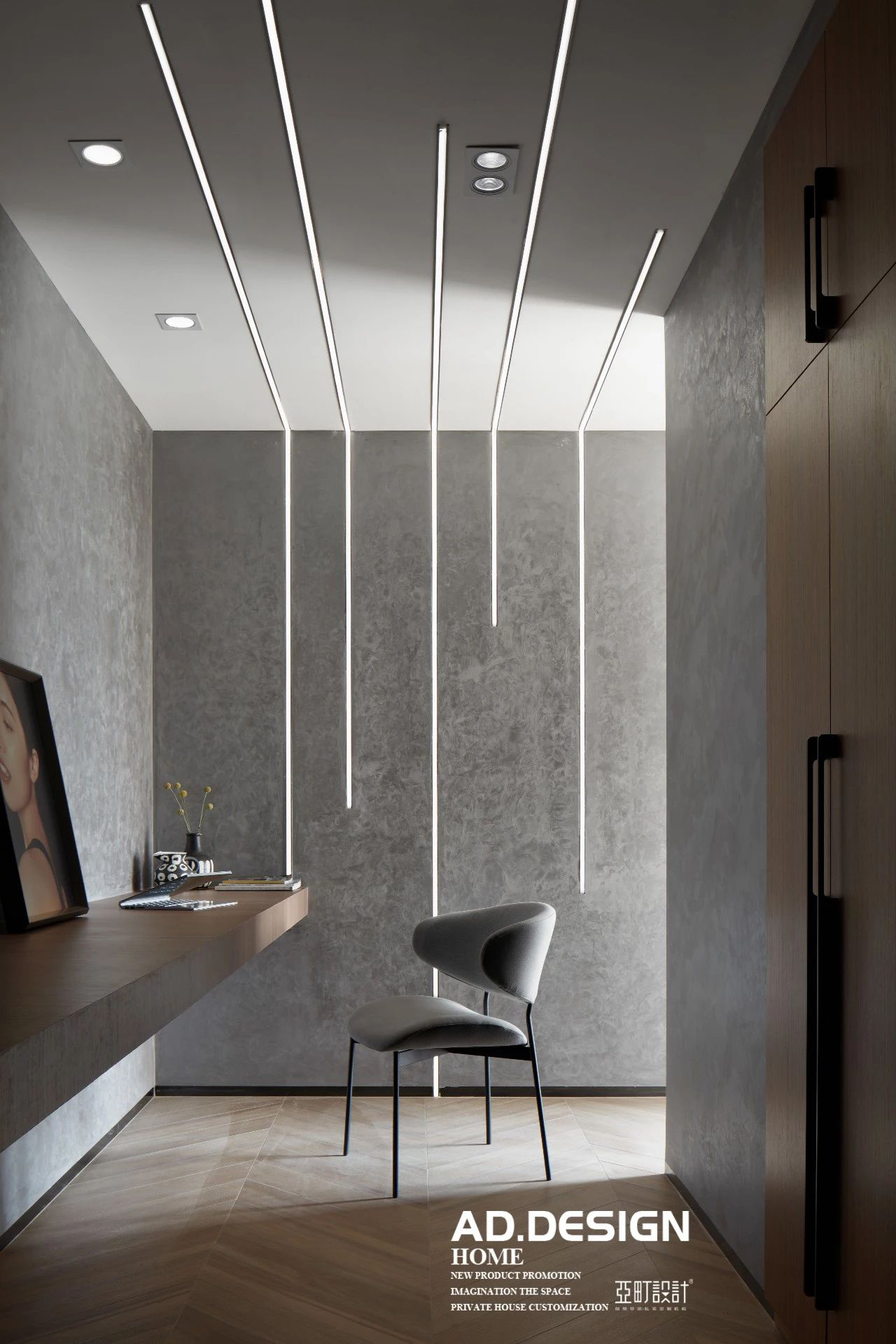 ▲二楼迎面是最受业主喜欢的游戏室,超长的书桌充分满足业主想要两人同时在此玩游戏的诉求,甚至在有朋友到访时能组团来个“开黑”。从墙到顶的线型灯的设计更渲染出极具个性的空间活力,形成属于此空间独特的光美学。