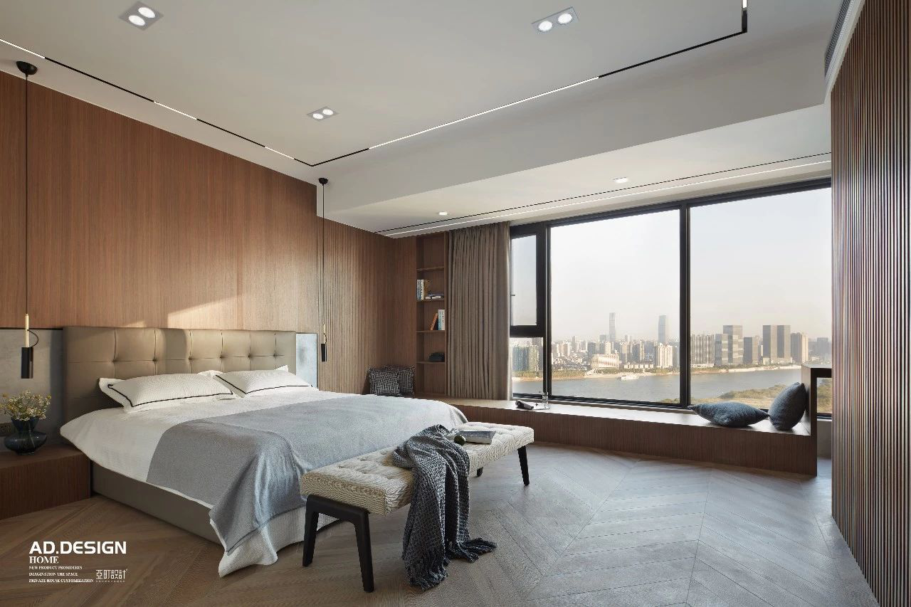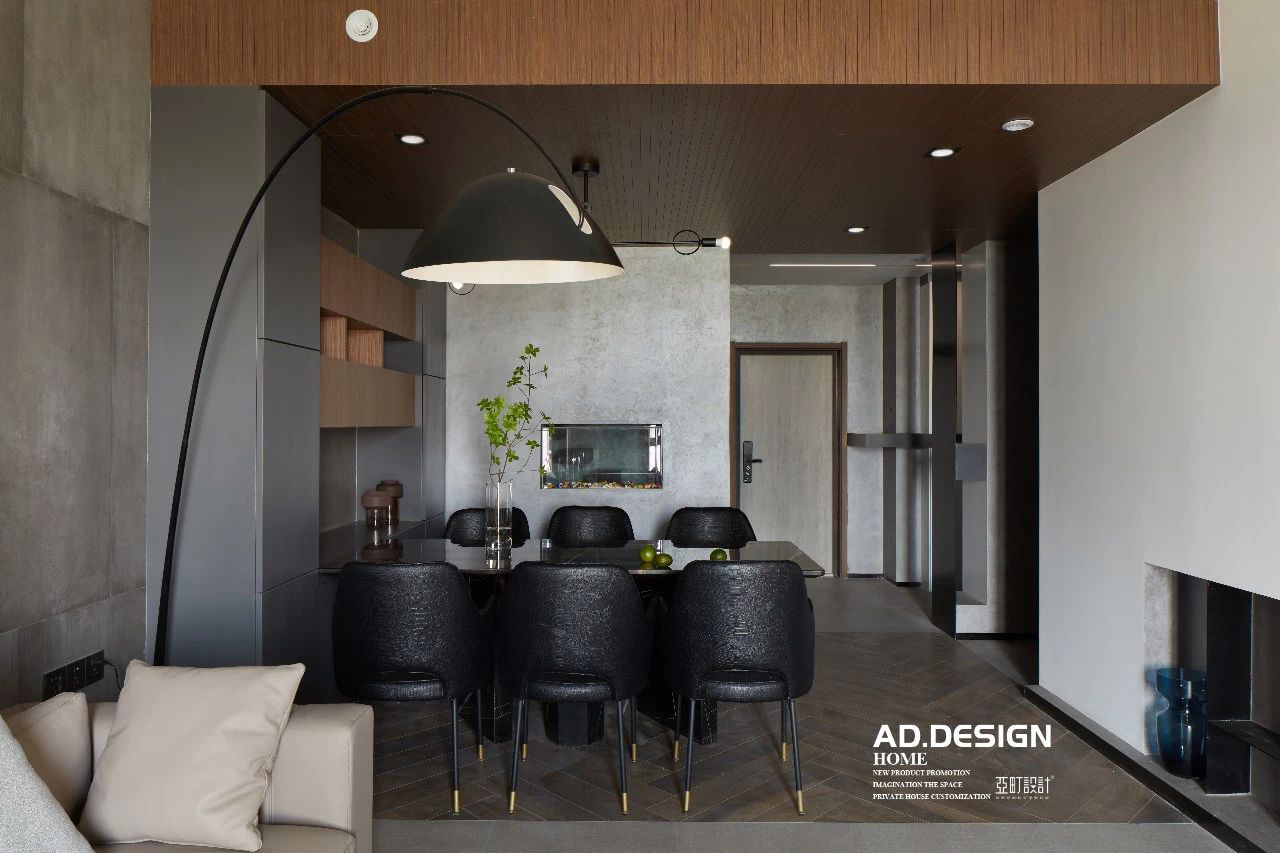 房子靠江,拥有绝佳视角,在平面设计上对窗户位置做了严谨考究,设计过程中,设计师结合业主需求与周边环境的融入出了很多稿方案,最后结合业主自身的喜好与习惯,得到了现在这个完美匹配业主喜好的居住空间。美学、人体工程学是这个整体空间的主要特性,设计上主要是运用黑白等深色调的材质创作一个舒适、高级的空间感。